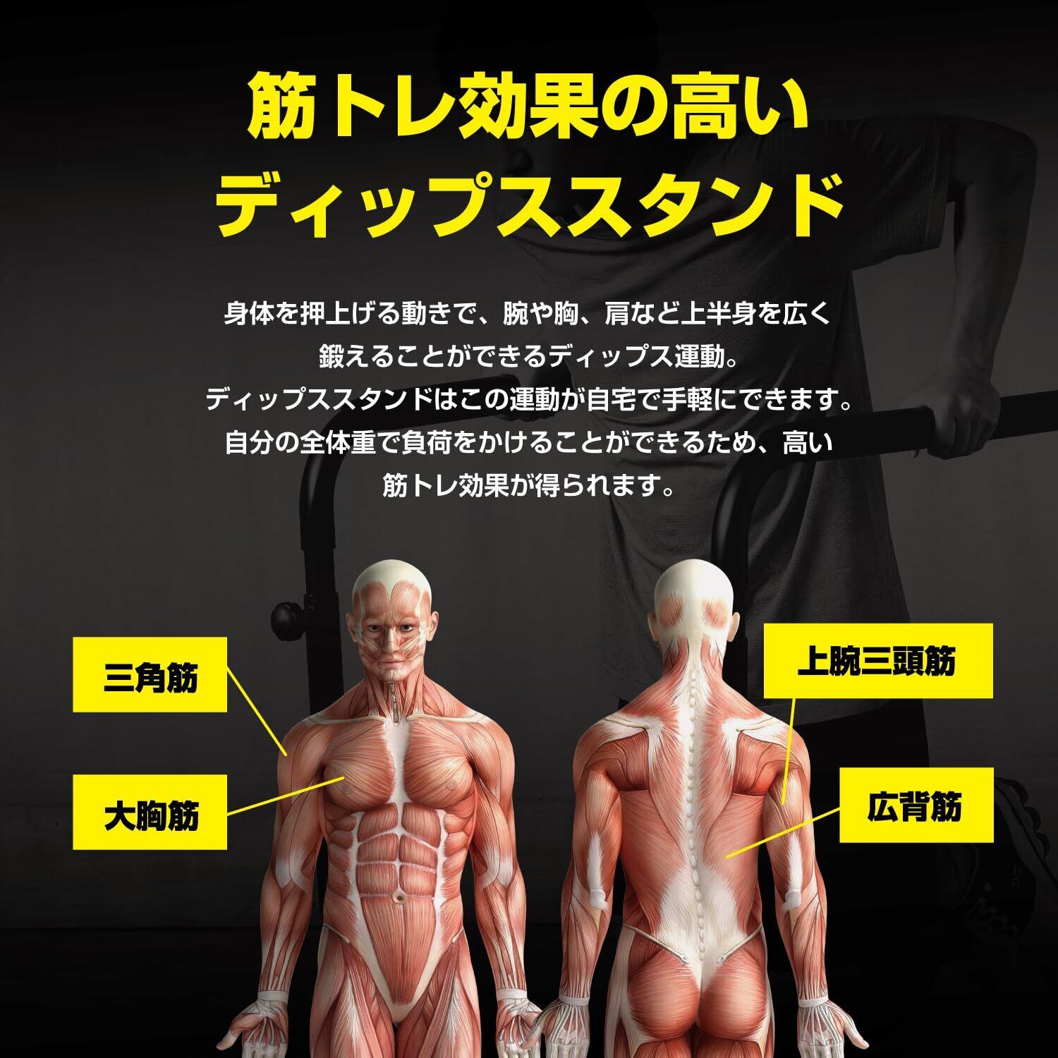 【鍛えられる主な筋肉】肩の筋肉である三角筋、上腕の裏側にある上腕三頭筋、胸の筋肉である大胸筋、肩甲骨周辺にある小さな筋肉群(インナーマッスル)など
