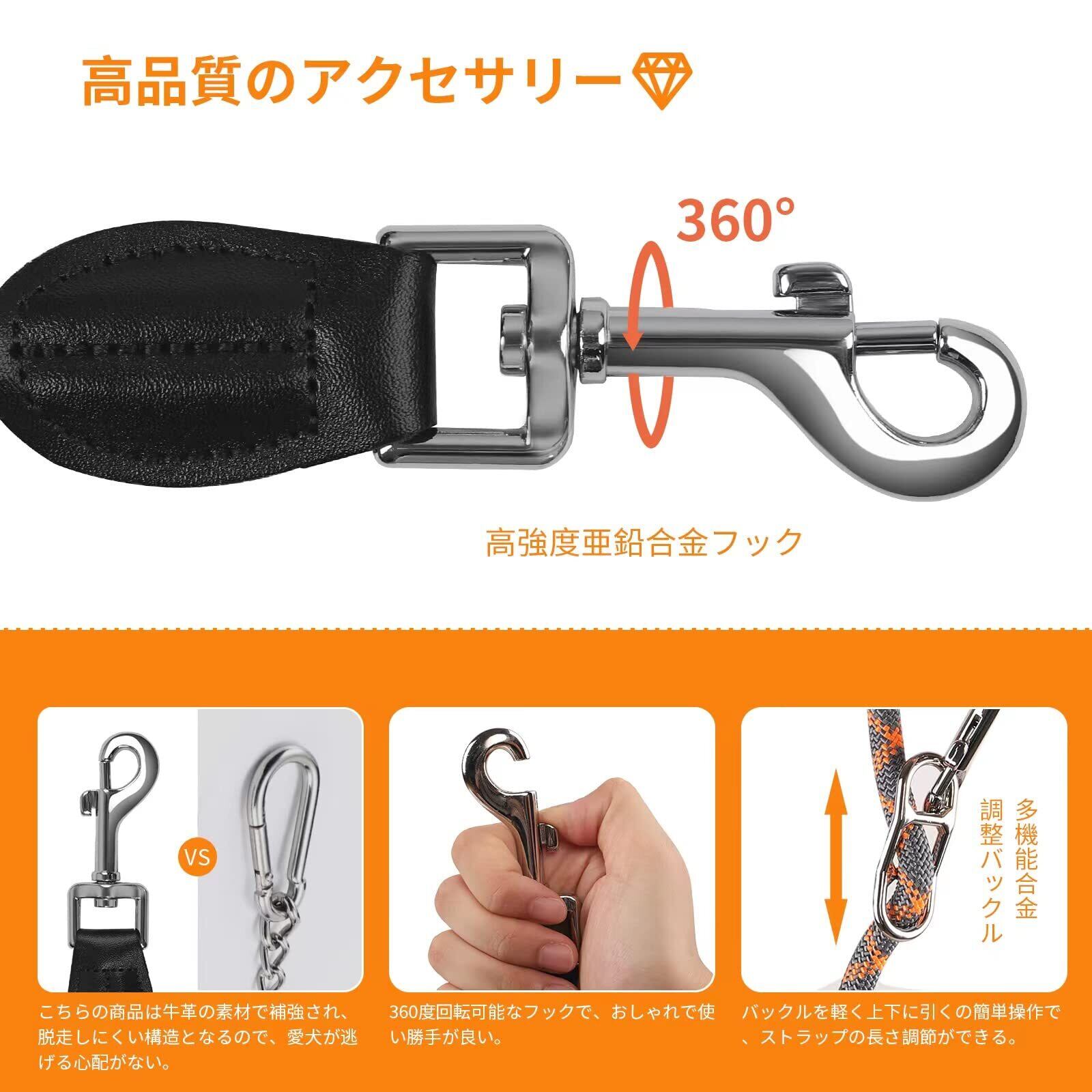 【360度回転式ナスカンと自由調整のバックル】リードを繋ぐナスカンには、最大200kgの引っ張りテストにもクリアした高強度の亜鉛合金を採用。そして360°回転できの上に、ナスカンの周りに高品質の牛革の素材で補充されるので、犬が全力で走り回ったり暴れても全然大丈夫です。長さ調整用のバックルはお好みの長さに調節可能で、オーナ様や犬の体格、お好みの散歩スタイルに合わせて調節でできます。 そして、体型が違う家族でシェアして使えます。