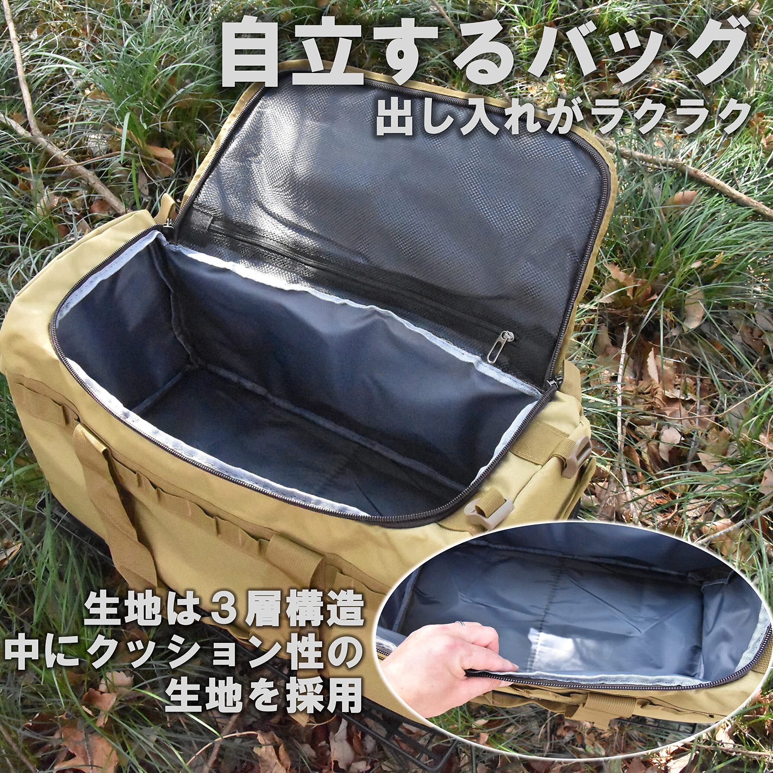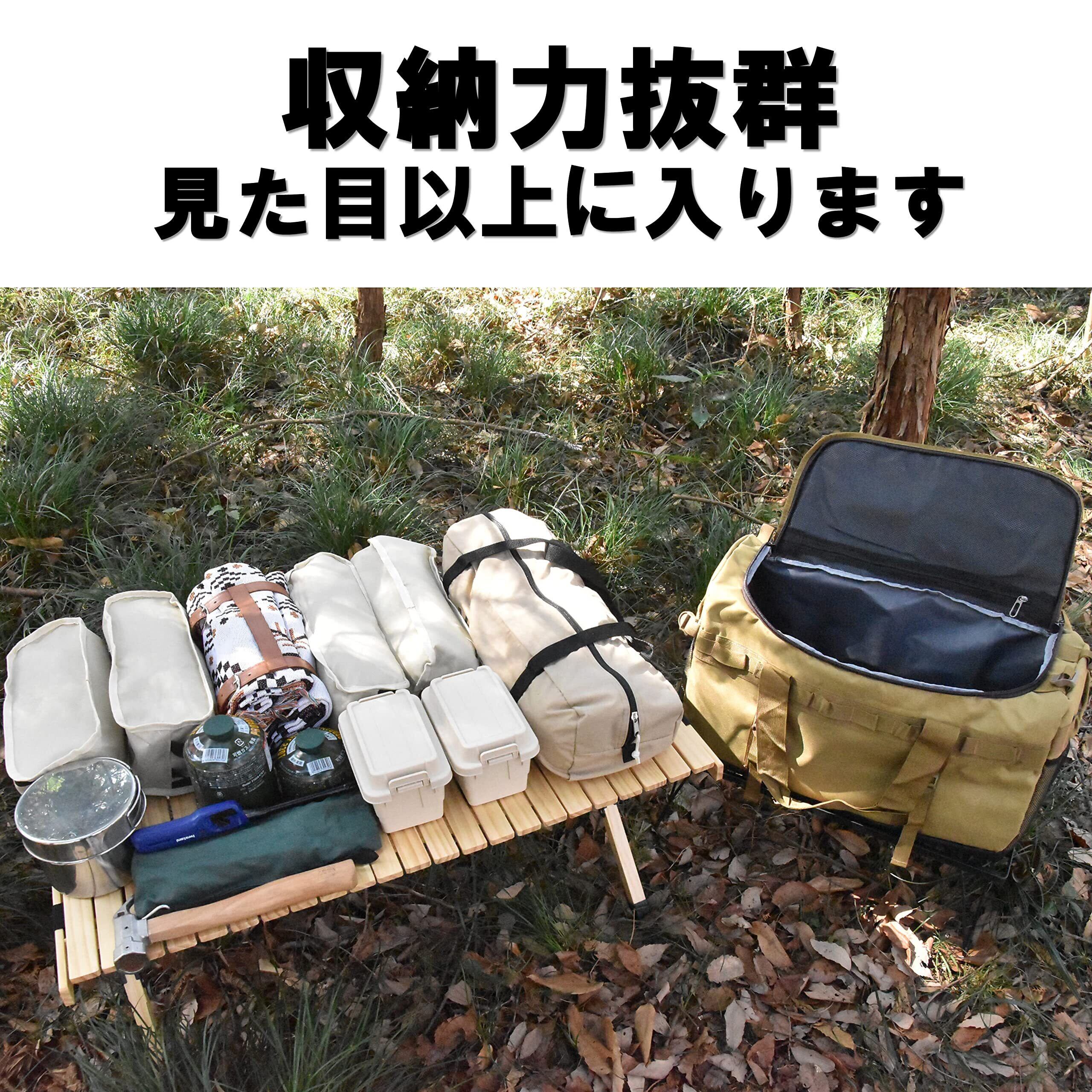 【大容量収納】約53Lの収納力を誇ります。キャンプ道具などアウトドア全般、旅行時の荷物などを収納できる大型アウトドアバッグです。汚れに強く、引き裂き強度の強いナイロン製オックスフォード生地を使用。側面にはクッションが内蔵されており、多少のごついギアをいれたりできます。開口部の裏にはメッシュタイプのファスナー付き収納があるため、小物の収納に最適です。
