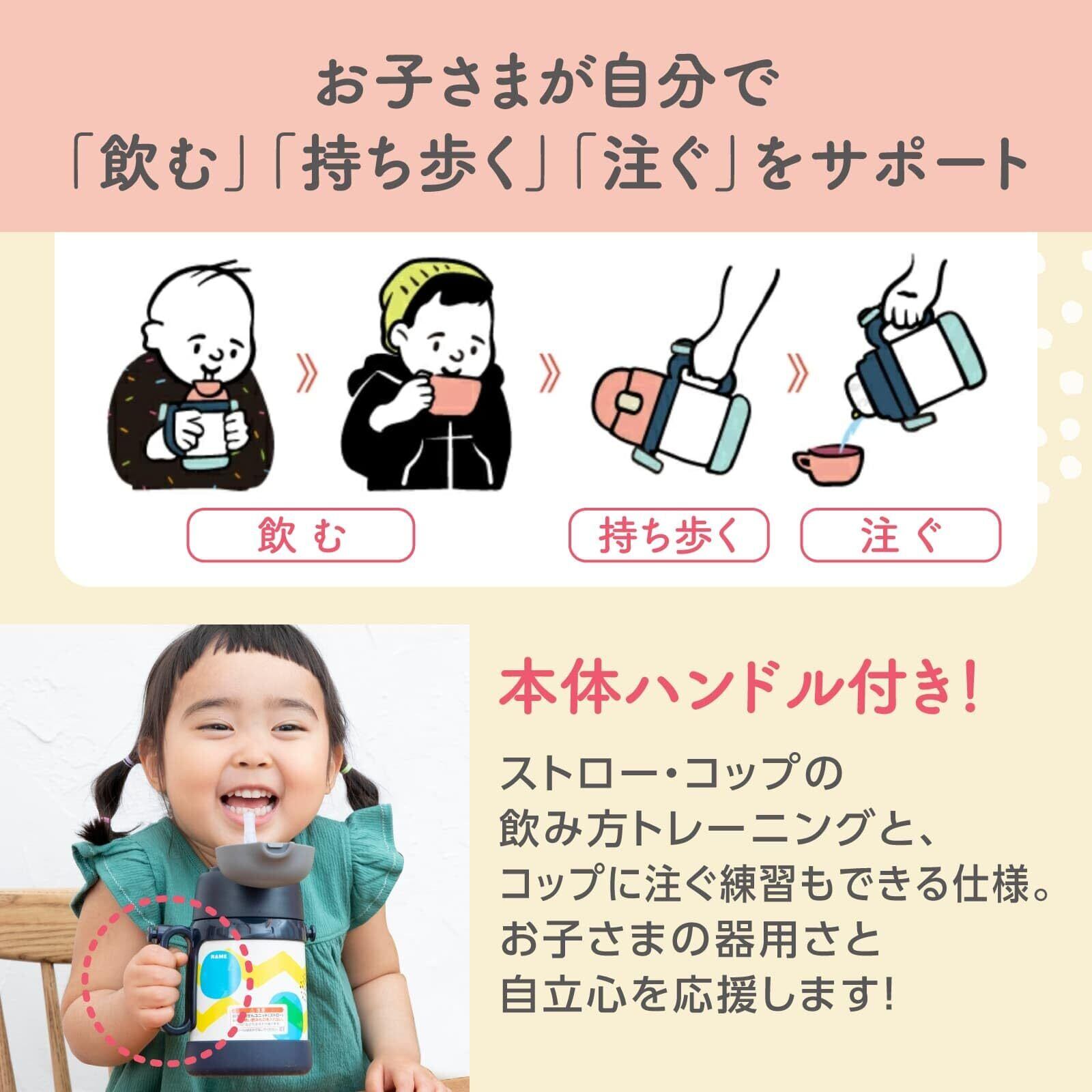 【お子様の「できる!」をサポート】成長に合わせてコップ飲みとストロー飲みの2WAYで使える子供用水筒。小さい手でもしっかり握れるハンドルで注ぎやすく、お子様の器用さと自立心を応援します。