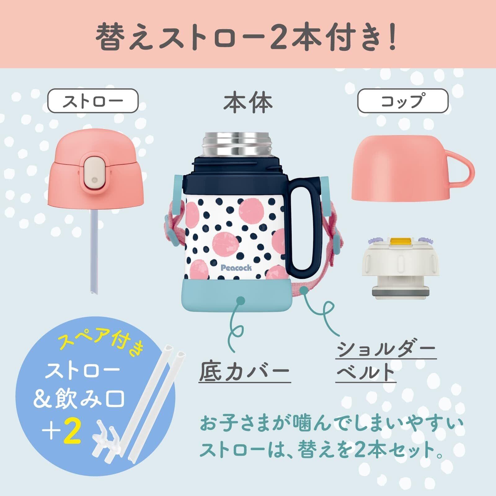 【2wayキッズ水筒】 ピーコック 子供用水筒 400ml WEB限定予備ストロー付 魔法瓶 保冷保温 コップ付き 水筒 保温瓶 幼稚園 通園 通学 ワンタッチ ピンク ASK-W40P P