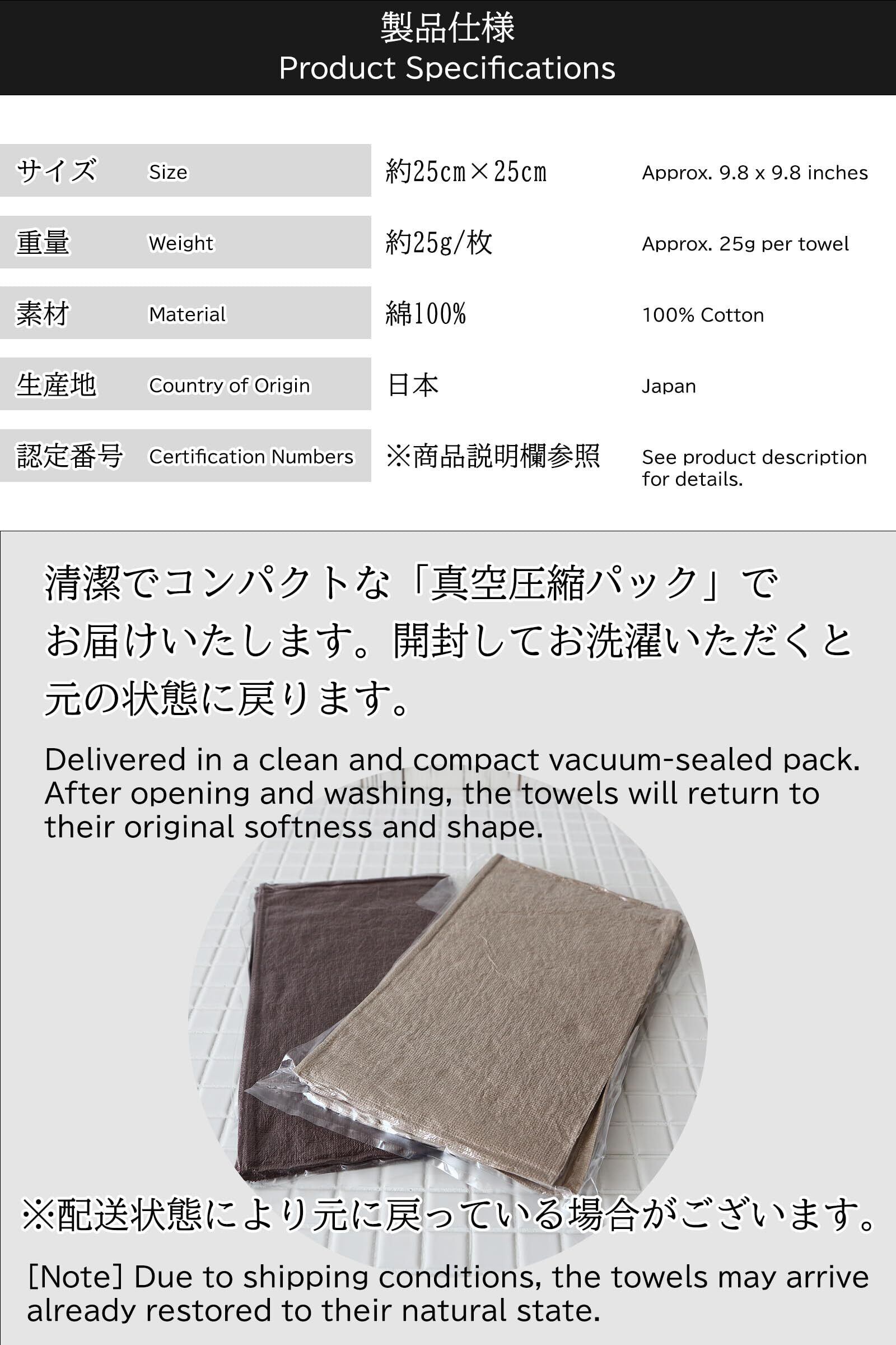 サイズ:約25cm×25cm 重量:約25g/枚 デザイン(認定番号):ネイビー(第2021-1129号)、ホワイト(第2022-1032号)、ミックスグレー(第2021-918号)、ピンストライプグレー(第2021-917号)、リバーシブルネイビー(第2022-1326号)、ブルー・グリーン(第2022-1325号)、しましまネイビー・しましまグレー(第2022-2634号)、テールグリーン・ブラック(第2023-2689号)、無地Aアソート4枚(第2021-945号) 素材:綿100% 生産地:日本(愛媛県今治市) ※モニターの発色の具合により実際のものと色が異なる場合がございます。 ※清潔でコンパクトな圧縮パックでお届けいたします。開封してしばらくすると空気を含み、元の状態に戻ります。配送状態により元に戻っている場合がございます。