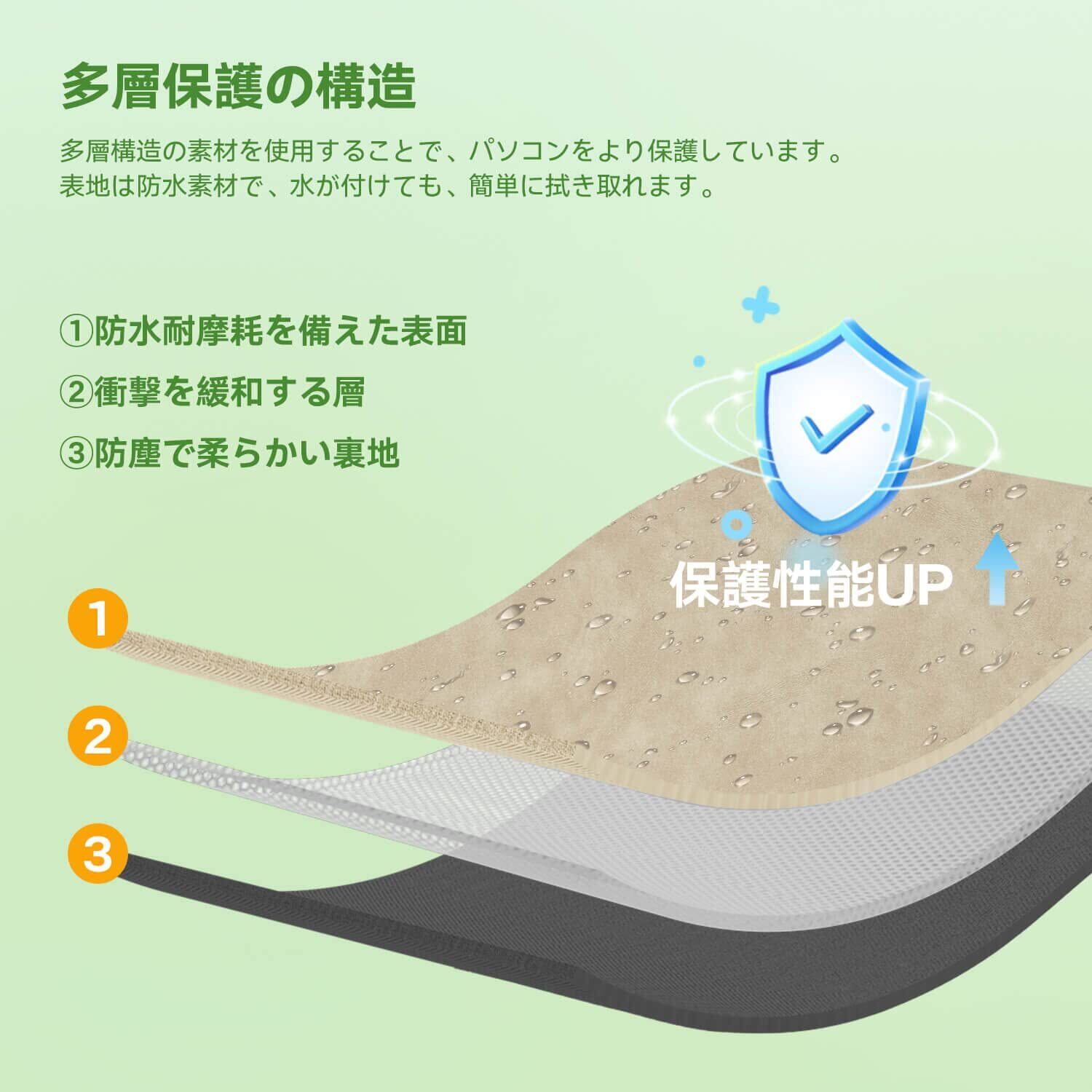 【優れた保護性能】ケースは3層の高品質な素材を使用し、厚手の生地と柔らかい毛織地で、傷の防止と衝撃吸収に優れています、ラップトップが傷つかないように保護します。商品の表面は水が浸透しにくい材質を採用し、水が付けても、簡単に拭き取れます。
