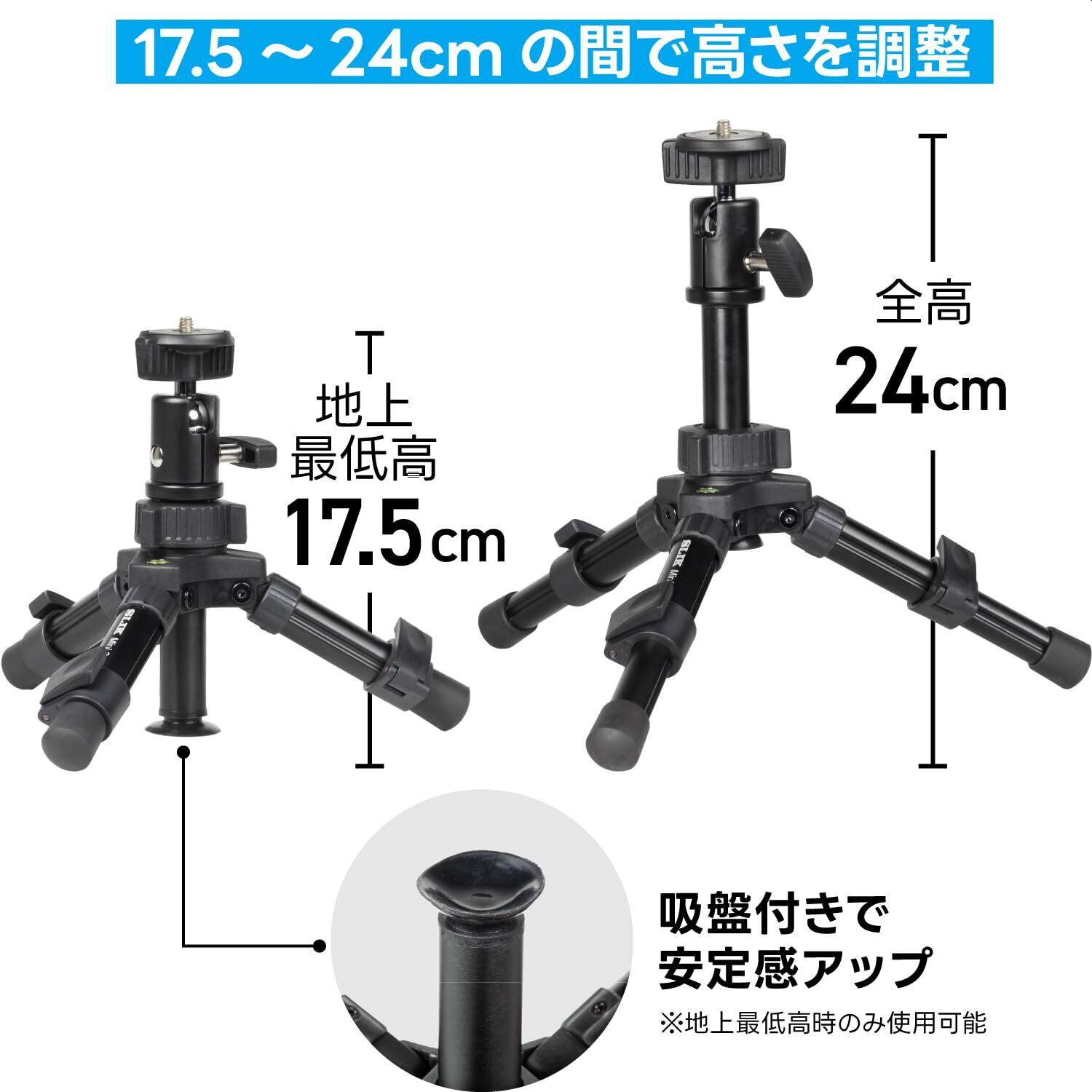 机の上での卓上撮影や地面ぎりぎりの超ローアングルでの撮影などに便利なミニ三脚です。小型の三脚でありながら通常サイズの三脚と同じ構造をしているので、1kgまでの機材をしっかりと支えます。