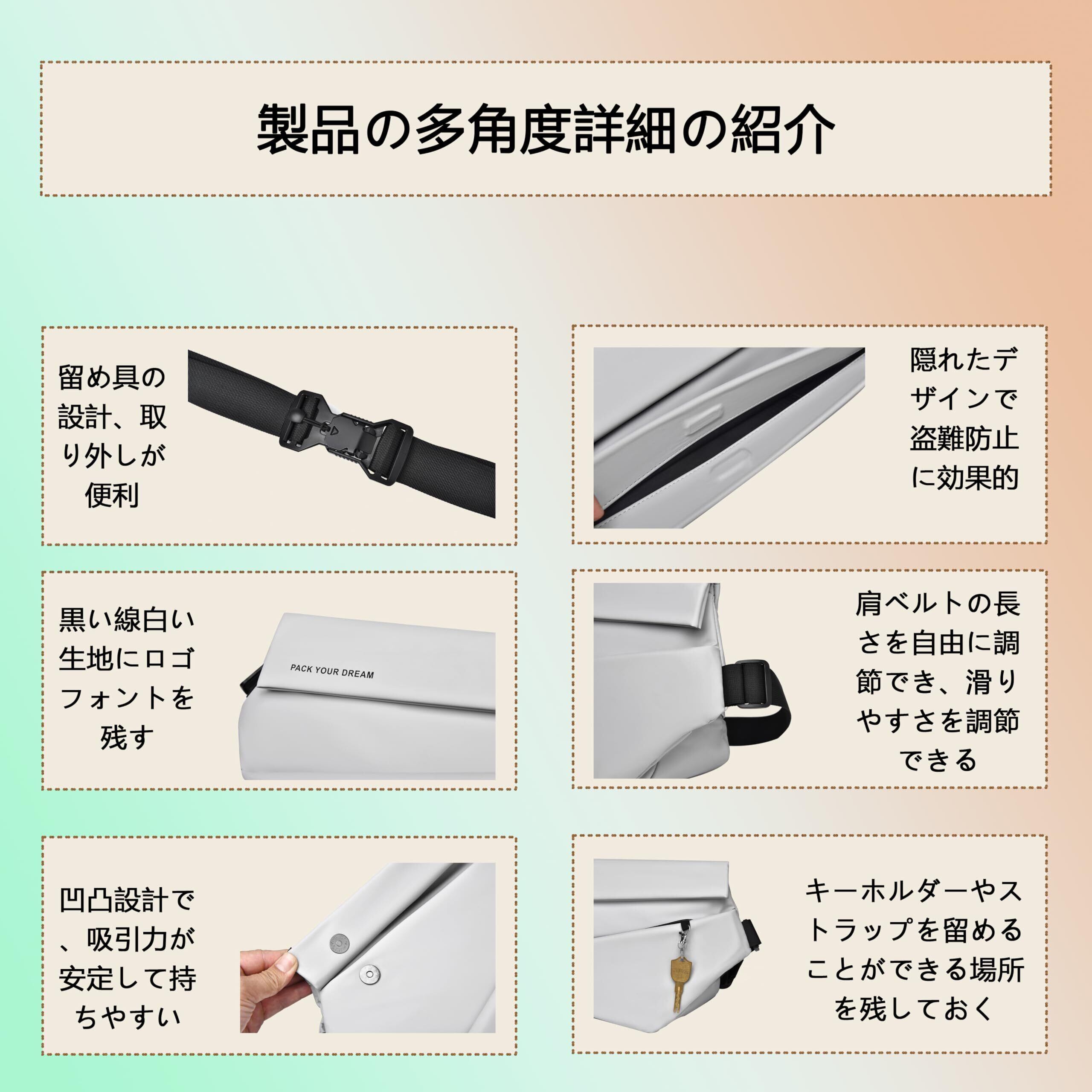 【洗練されたデザイン】ベーシックなシンプルデザインを追求して、どんな服装にも合うショルダーバッグに仕上がりました。私服での通勤、通学、休日のラフな格好、子育て世代のお父さんまで、幅広い服装に合う機能美ショルダーバッグです。