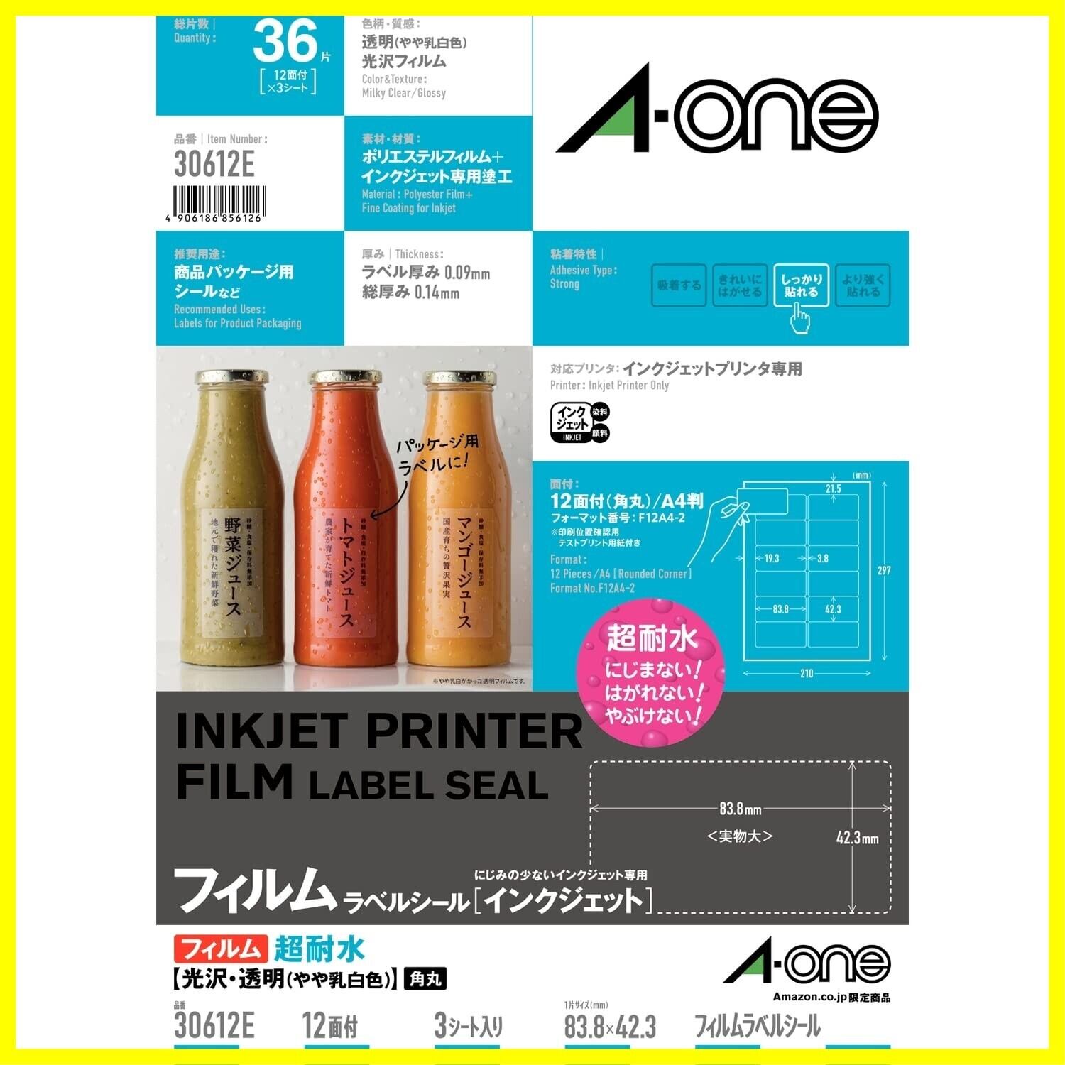 エーワン ラベルシール インクジェット 超耐水 光沢フィルム 透明 12面 3シート 30612E
