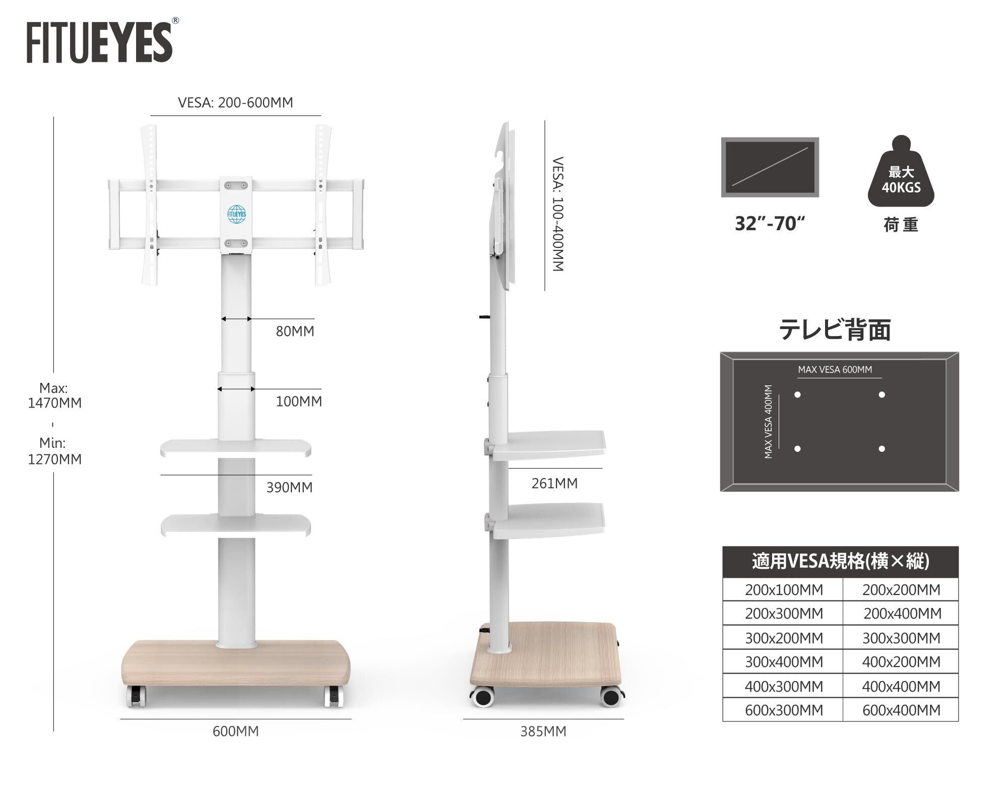 【VESA規格対応】汎用性の高いVESA規格(テレビ背面のネジ穴間の距離)対応、最小限は20×10cm、最大限は60×40cmです。当製品が32~70インチのテレビやモニター(40kg相当)に適応します。