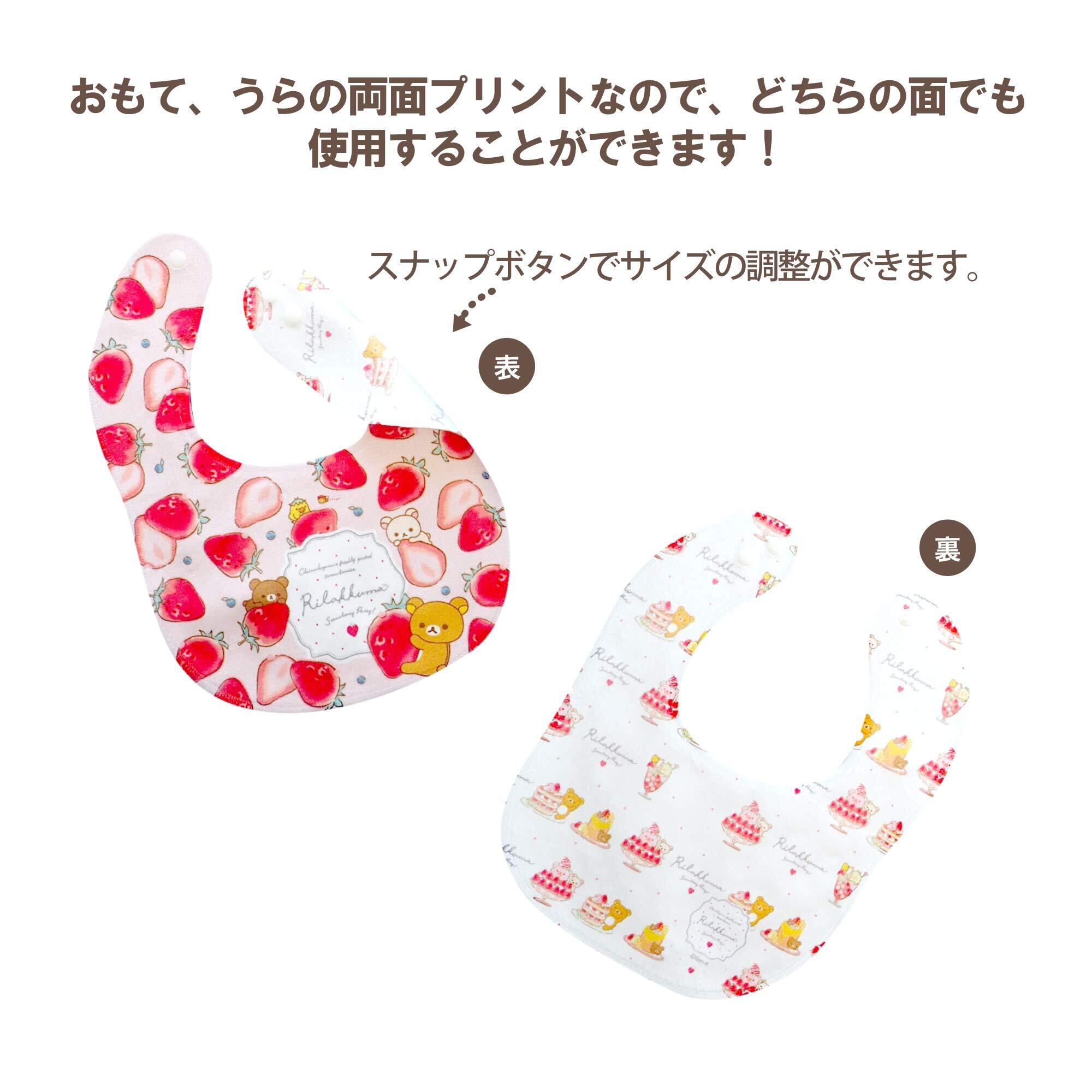 【機能】肌触りのよい吸水速乾の生地は、食べこぼしやよだれをしっかり吸収してすぐに乾きます。表裏違ったデザインの両面プリントで、お洋服のデザインに合わせてコーディネートできます。首回りは2段階のサイズ調整可能なスナップボタンで、お子様の成長やその日のお洋服に合わせて調整可能です。