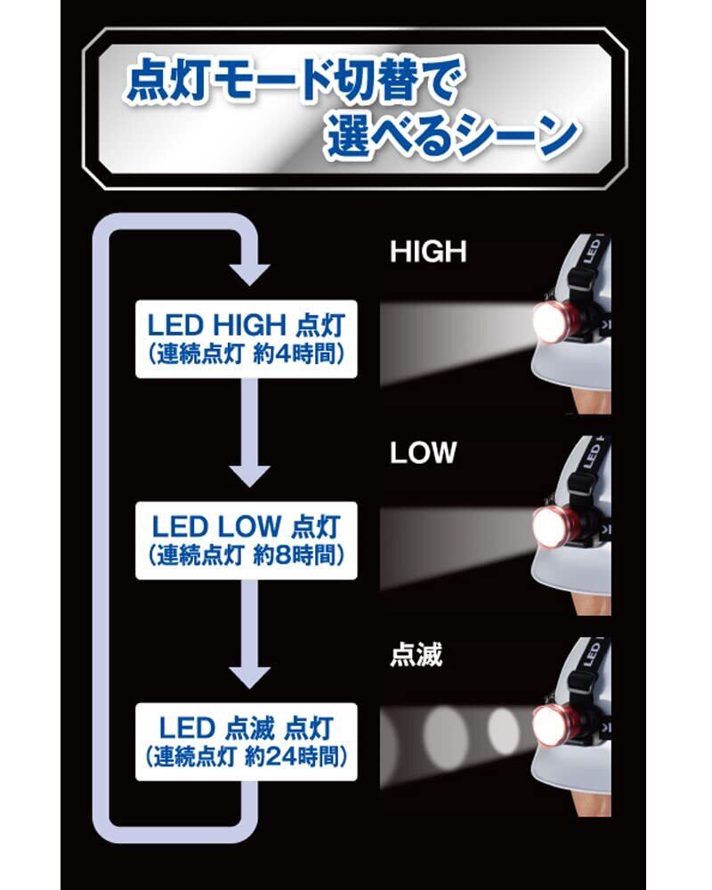 電池寿命:連続約4時間(HIGH)/約8時間(LOW)/約24時間(点滅)