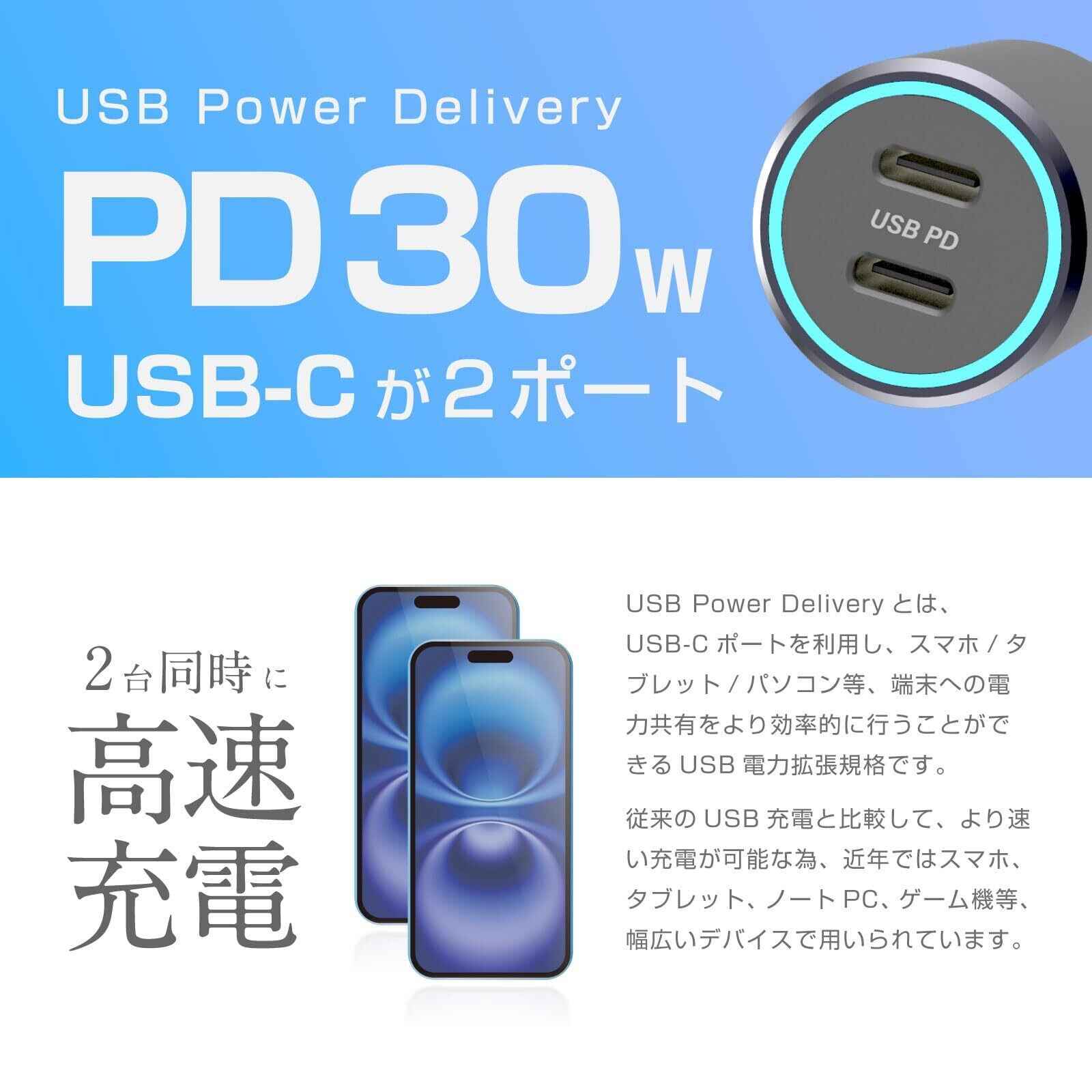 PD30W対応 合計2ポート(USB-C ×2)搭載。自動識別IC搭載 /端末に合わせて最適な電力に分配