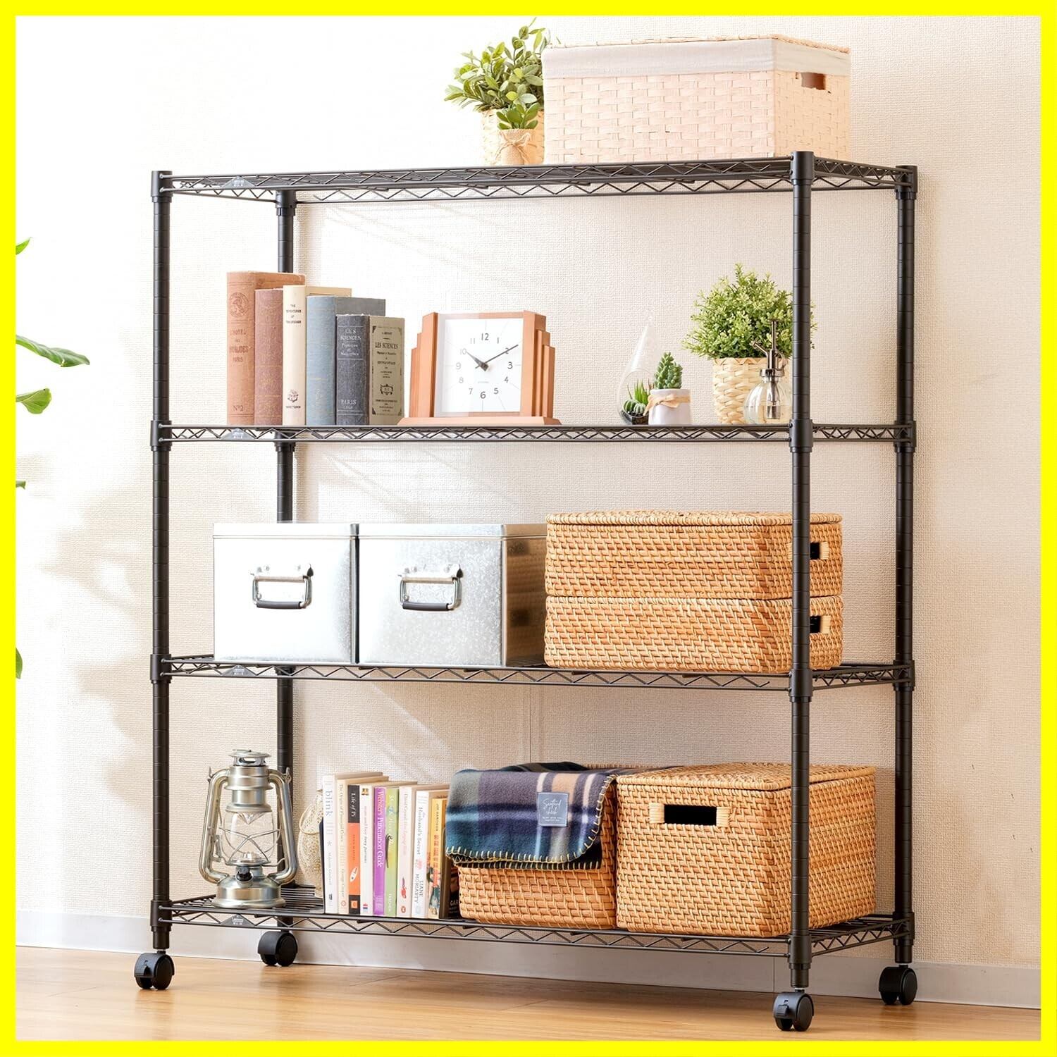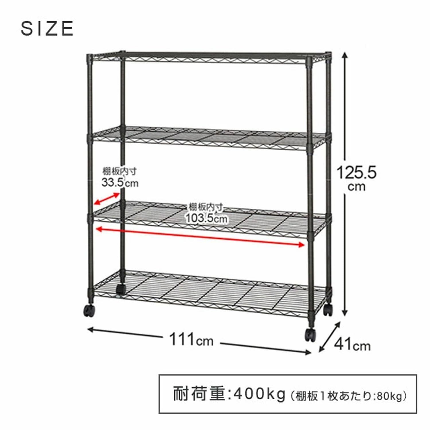 ドウシシャ ルミナス ノワール ラック 4段 幅110 奥行40 キャスター付き スチールラック 黒 ブラック 収納棚 おしゃれ キッチンラック サビに強い 組立簡単 幅111×奥行41×高125.5cm(キャスター込) ポール径25mm 耐荷重80kg NO1112-4