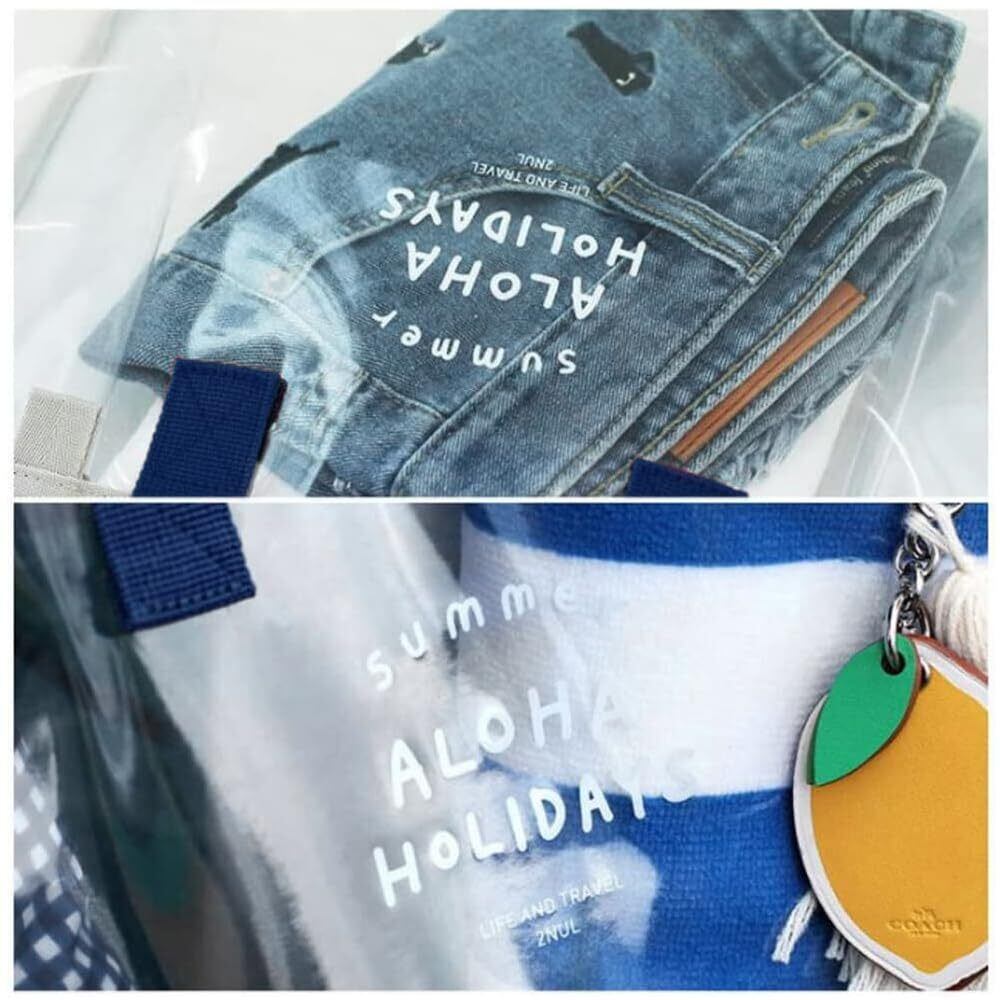 【防水PVC】耐水性PVC素材を採用した上、精密な縫製テクニックを利用して、しっかりとした生地です。また、防水で水をちゃんと弾いています。雨の日にもバッグの中身を湿すことは心配いらないです。透明のデザインなので、バッグの中身がひと目で確認できます。