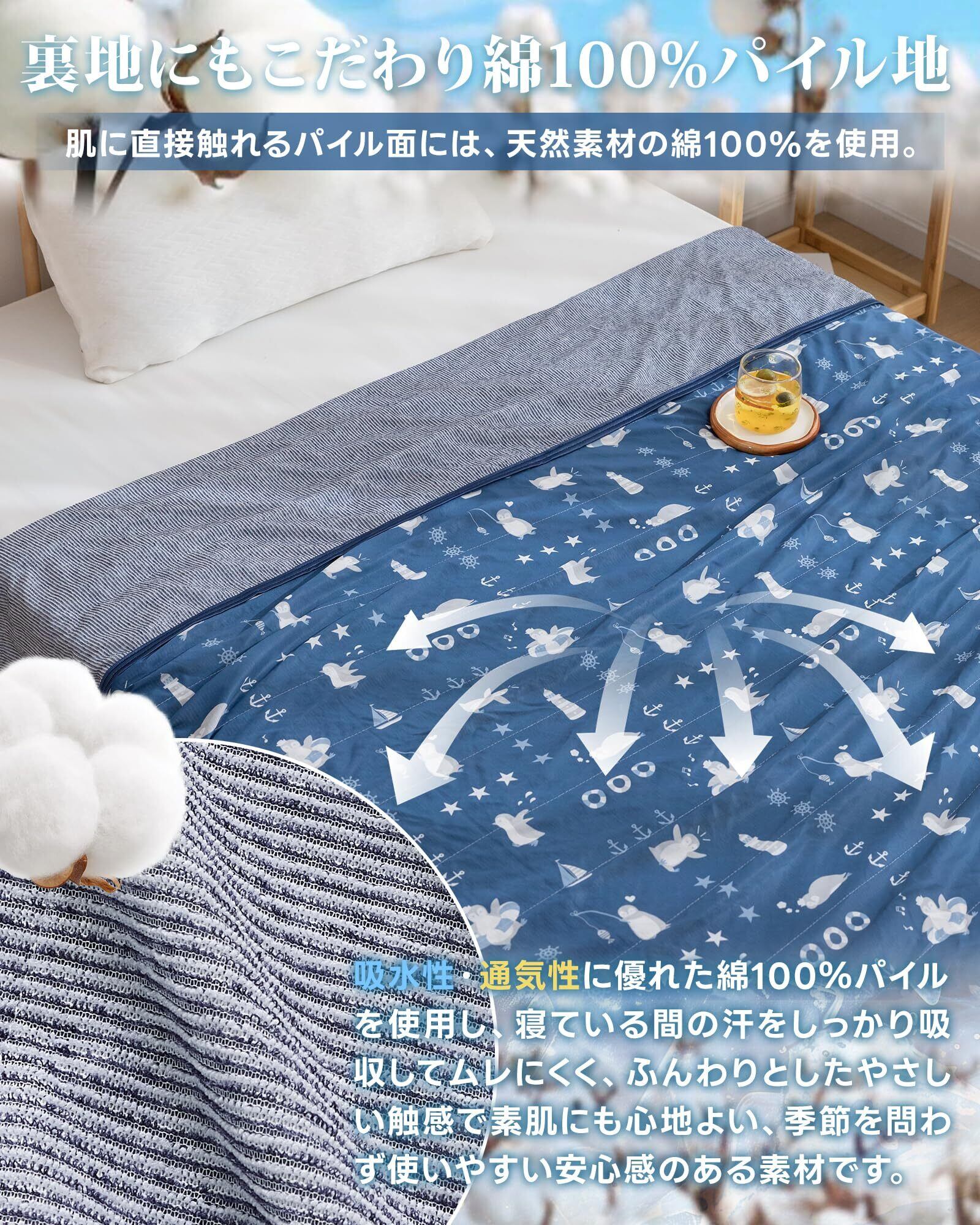 【タオル綿⁻天然素材パイル】 コットン素材は優れた通気性・吸湿性があり、不快な汗や湿気を吸って、素早く乾きます。いつもさらりと快適。肌触りがふんわりして、敏感なお肌の方でも心地良く快適に過ごすことができます。夏の深夜の時、温度が下がって、この面を使用してちょうどいい。