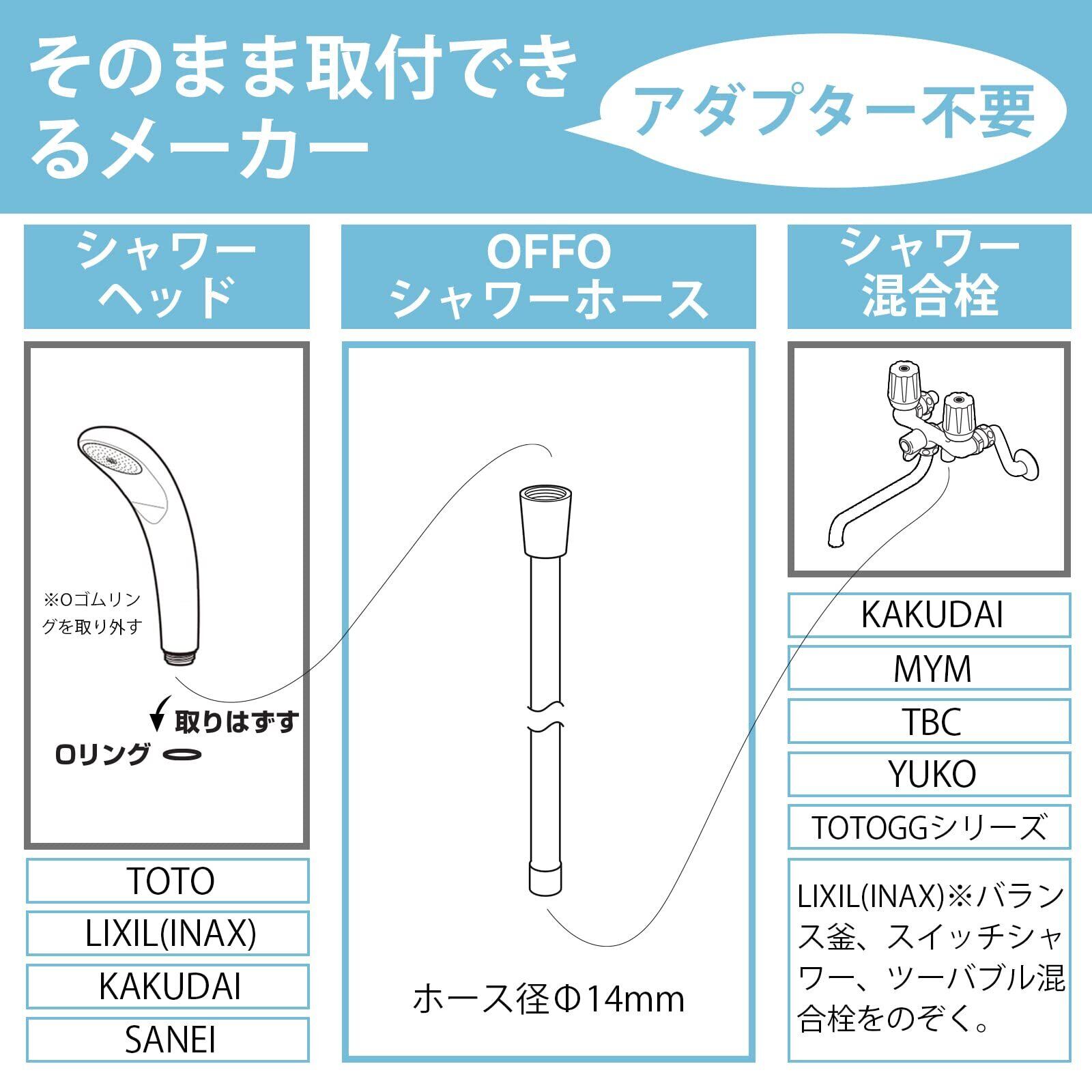 [適用するシャワーヘッド] 本品とシャワーヘッドを接続する側のネジサイズはG1/2です。OFFO、TOTO、LIXIL(INAX)※バランス釜除外、SAN-EI、カクダイのシャワーヘッドに直接取付できます。一部シャワーヘッドはネジサイズは合いますが、ヘッド根元のo-ringが邪魔になって接続できない可能性があります。その場合、シャワーヘッド根元のo-ringを取り外してください。o-ringを取り外した後に、水漏れが発生する場合、付属のパッキンを追加してく見てください。本品はKVKのシャワーヘッド用アダプターが付属しておりますが、KVKシャワーヘッドに取付る場合、アダプターKをお使って接続してください。
