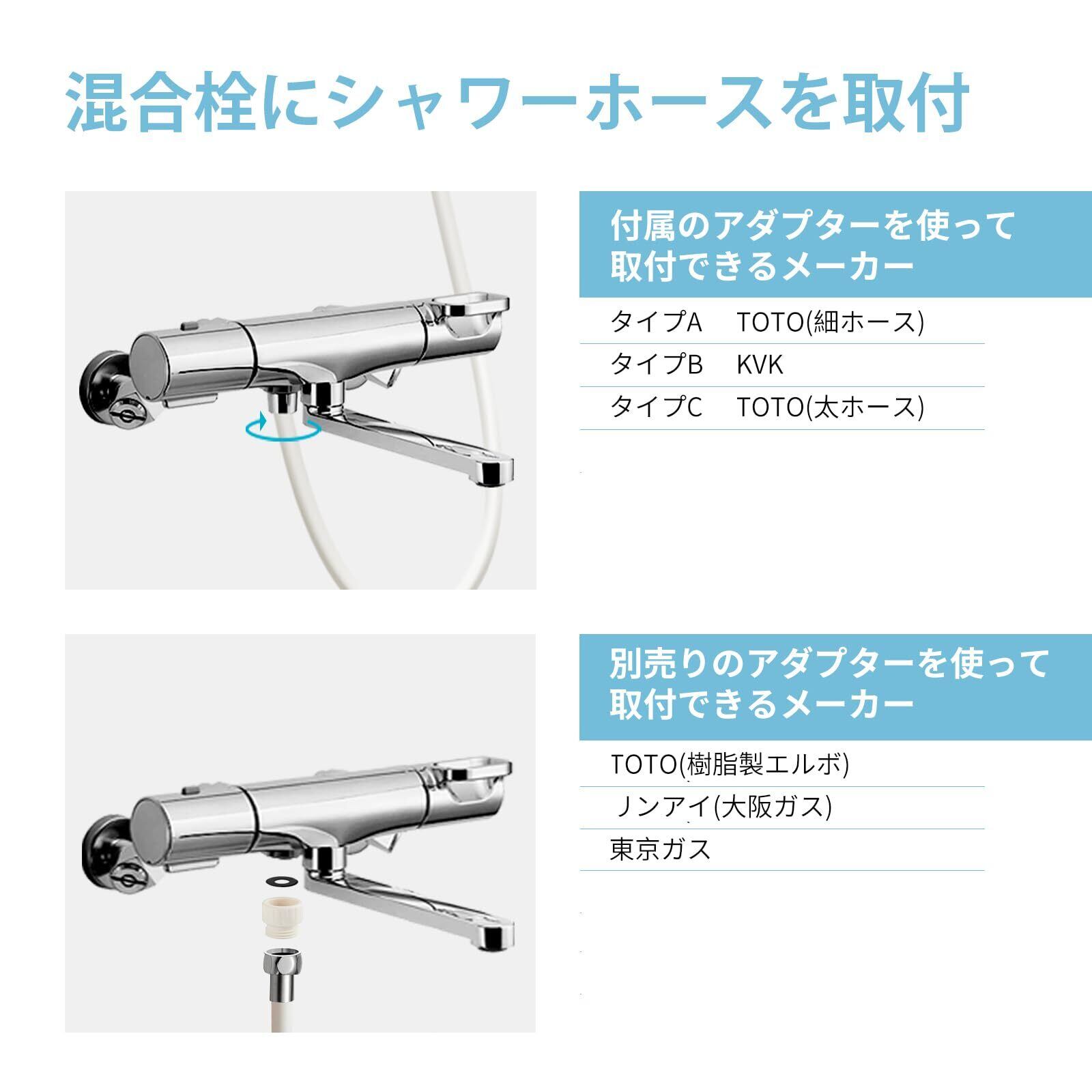 [適用する混合栓] 本品と混合栓を接続する側のネジサイズはG1/2です。本品はLIXIL(INAX),SAN-EI,MYMの混合栓にそのまま取付けできます。※LIXIL(INAX)バランス釜、ツーバブルシャワー混合栓、スイッチシャワー混合栓は接続できません。TOTO太ホース、TOTO細ホース、KVK水栓は付属のA,B,Cアダプターを使えば接続できます。