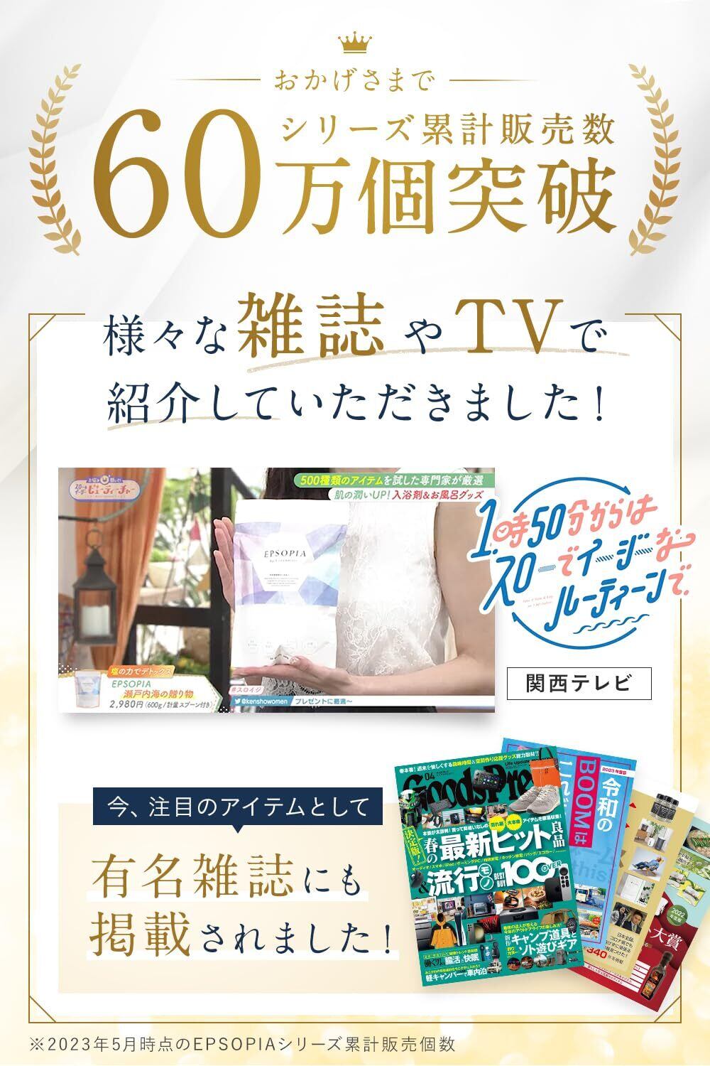 【ご使用方法】入浴時に浴槽へ付属のスプーン1杯を入れてください。(約13g)(冬場などの乾燥時期や保湿・保温を高めたい場合には3~5杯ほどお入れください。)よく混ぜて溶かします。ナトリウムを99.5%以上除去しておりますので、追い焚き循環式や24時間風呂でも使用できます。残り湯を洗濯にもお使い頂けます。国産100%エプソピアは瀬戸内海に面した製塩工場で製造されています。