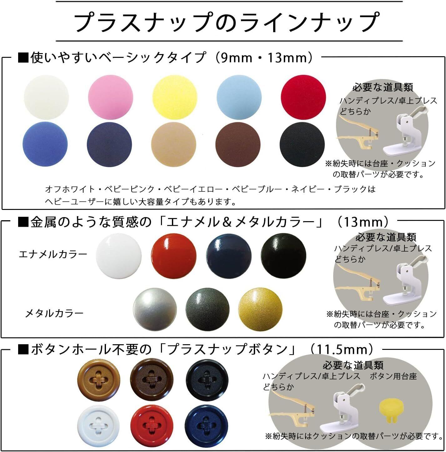 糸 ・ 針 不要で取り付けられる プラスナップ 。 金属アレルギー の方にも安心の プラスチック 製。