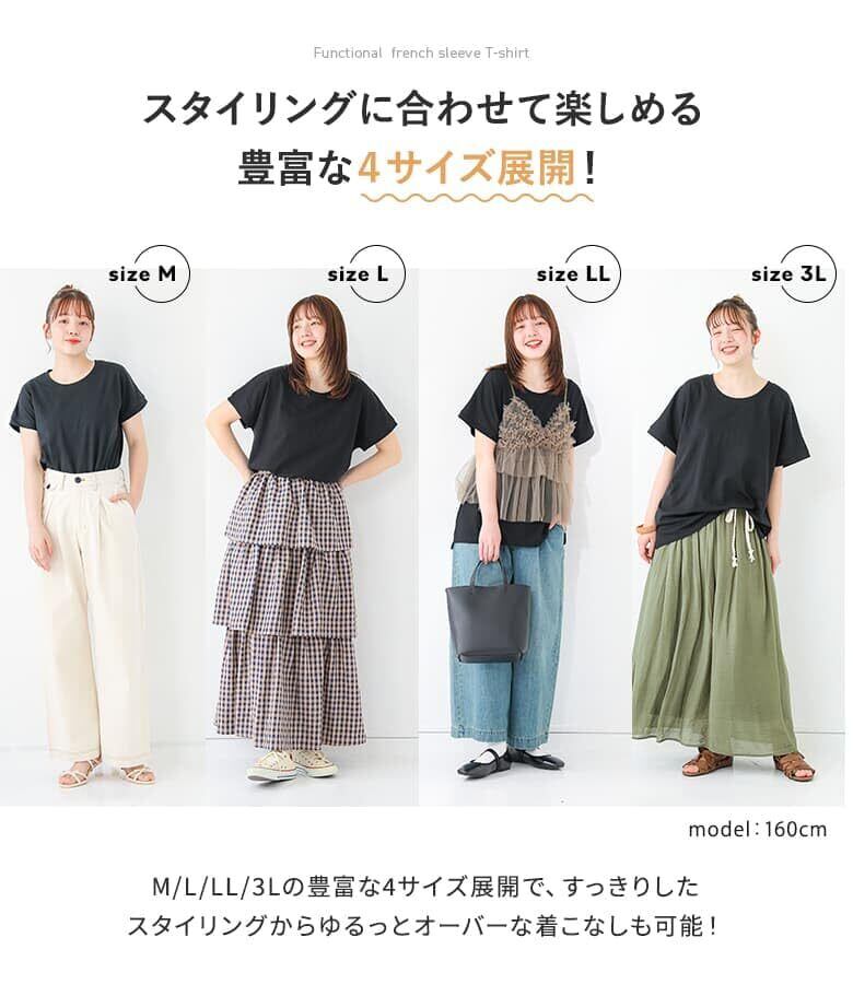 とにかく着回せるフレンチスリーブTシャツ。シンプルなデザインなので、様々なスタイリングが楽しめます。袖が短めだと二の腕が気になってしまうフレンチスリーブですが、長めに設計することでお悩み解決◎