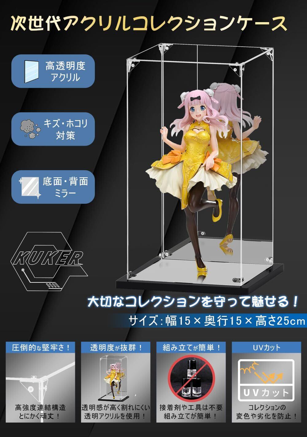KUKERフィギュアケース アクリルケース UVカット コレクションケース ディスプレイケース 台座 背面ミラー 組み立て簡単 頑丈 汚れ防止 手袋 クリーニングクロス付き(15×15×25cm, 台座ミラー+背面ミラー)