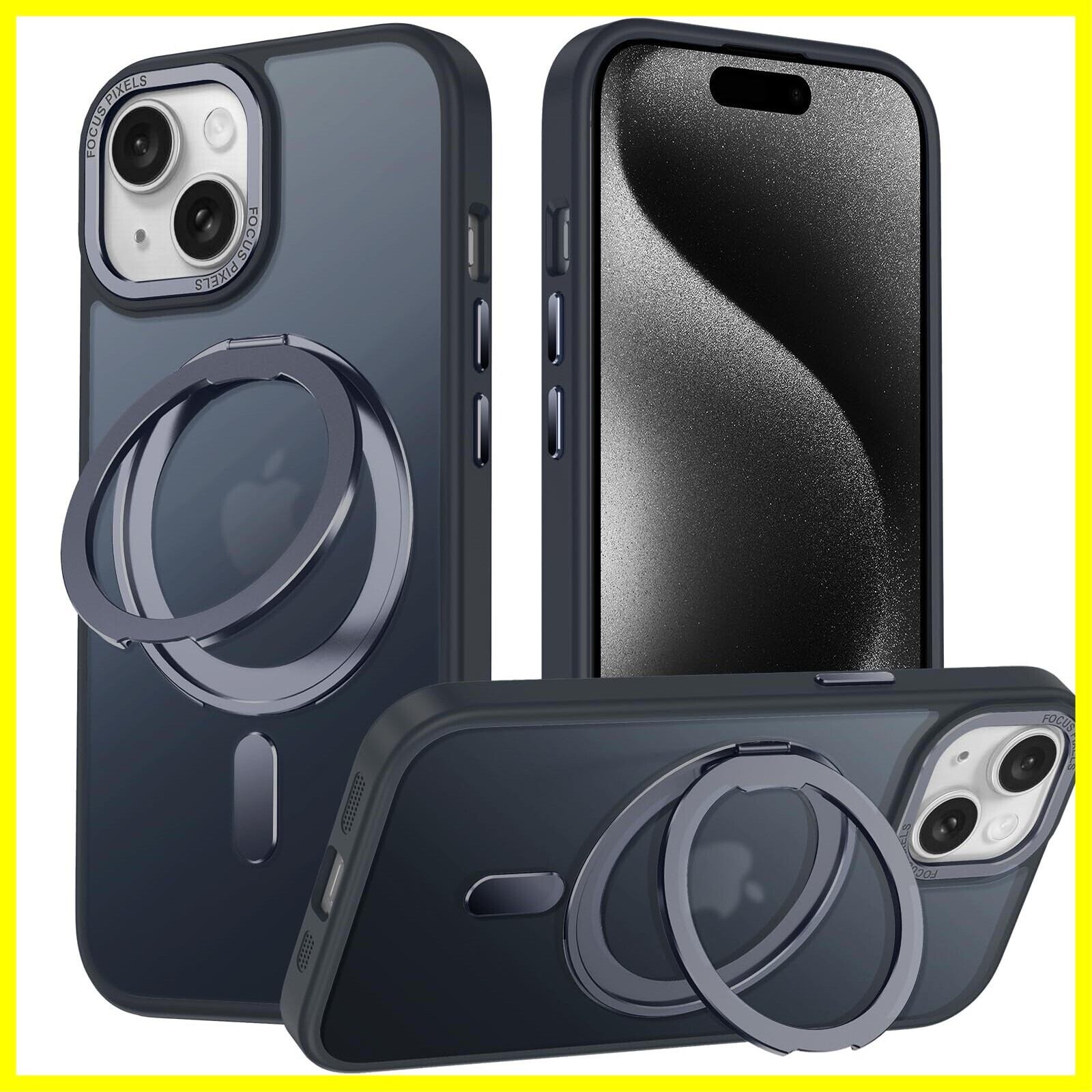 iPhone 15 適用 ケース Magsafe対応 アイフォン15 カバー 360°回転スタンド Uovon スマホケース アイホン15 携帯ケース ワイヤレス充電 車載ホルダー 対応 ストラップ穴付き 半透明 指紋防止 黄变防止 ・ ブラック