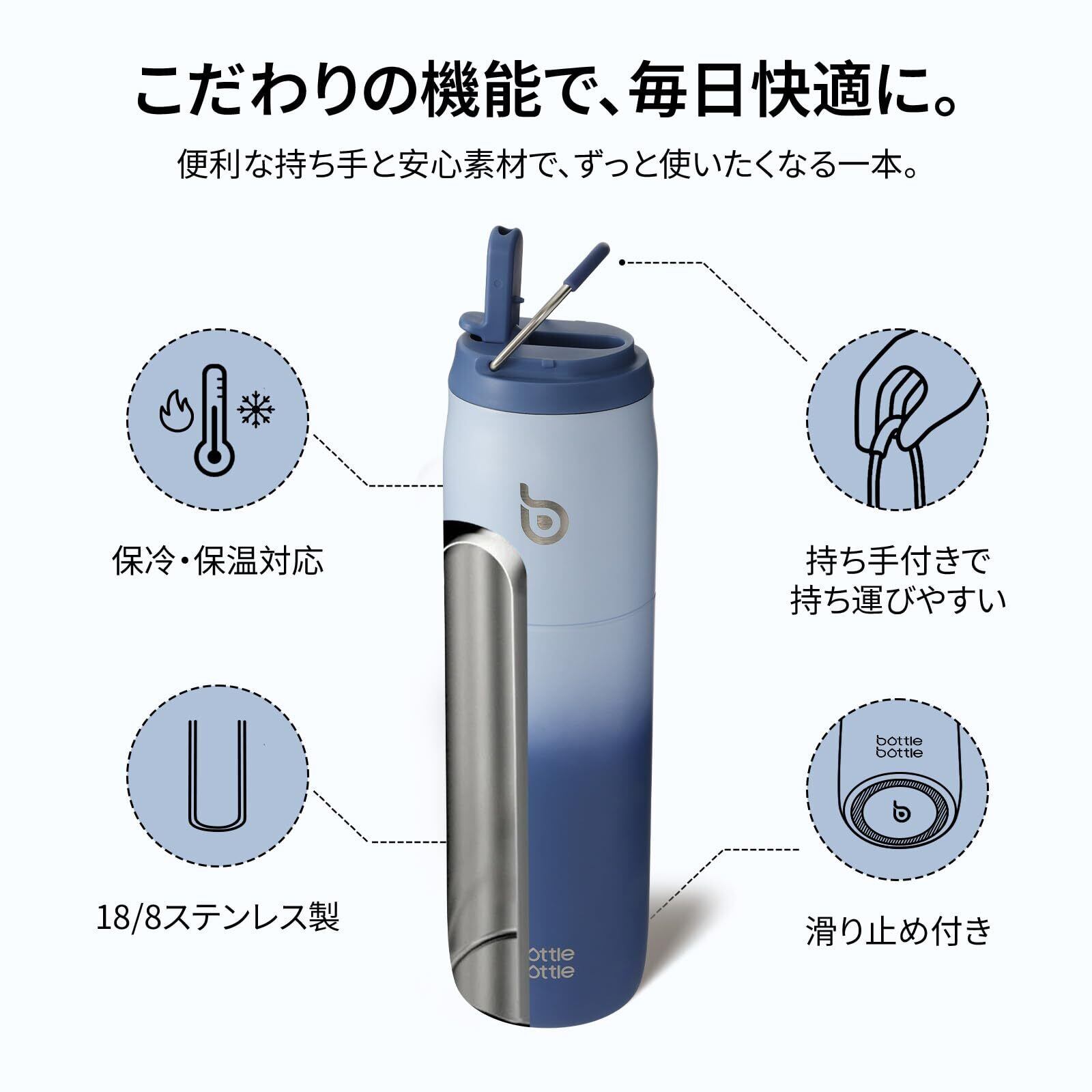 BOTTLE BOTTLE 水筒 1リットル 大容量 1000ml ストロー付き 直飲み 保温保冷 真空断熱 子供 大人 持ち手付き おしゃれ 1L ボトル ステンレス 魔法瓶 二重構造 女の子 男の子 持ち運び スポーツ アウトドア ブルー