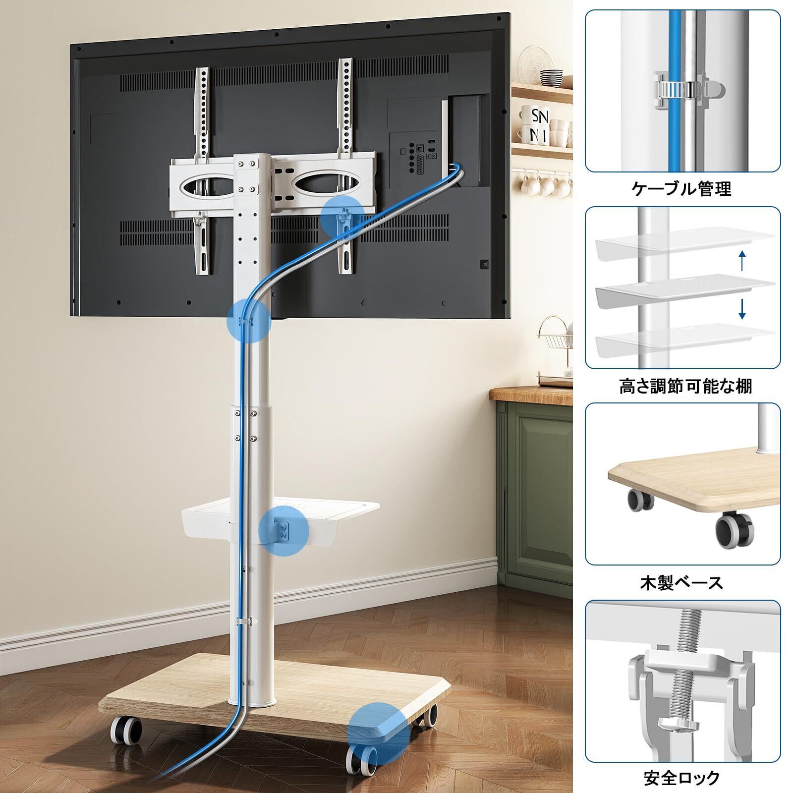 商品仕様:テレビ台サイズ:長さ55cm*幅38cm*高さ113 cmから139 cm。メディア棚は最大荷重が5 kgです。移動式のTVスタンドはオフィス、ホーム、学校、会議室、ホテル、空港、ロビー、病院、研究所、教会、ショッピングモールなどの場所に最適です。ホワイトテレビスタンドの後ろにケーブル管理システムが付きます。ケーブルを管理しやすく、テレビとAV機器の周辺を綺麗に保ちます。