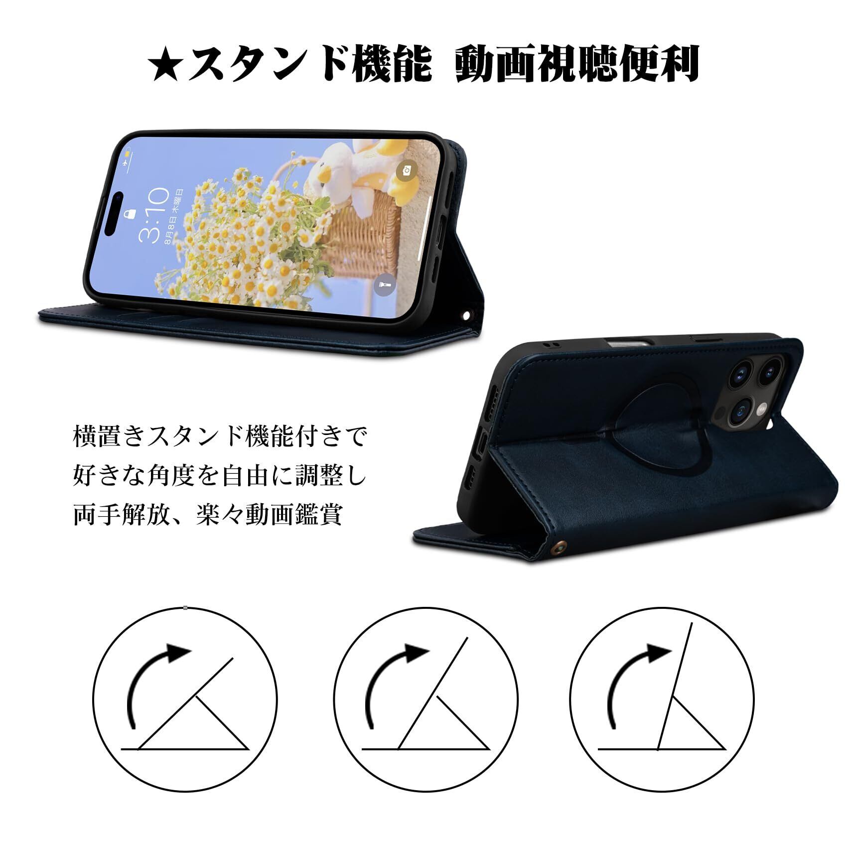 スタンド機能:このiPhone 16 pro max 用 カバー手帳型はスタンド機能が付いて、横向いて斜めに立てて、お好きな角度に調整することができ、長時間の視聴でも疲れない。