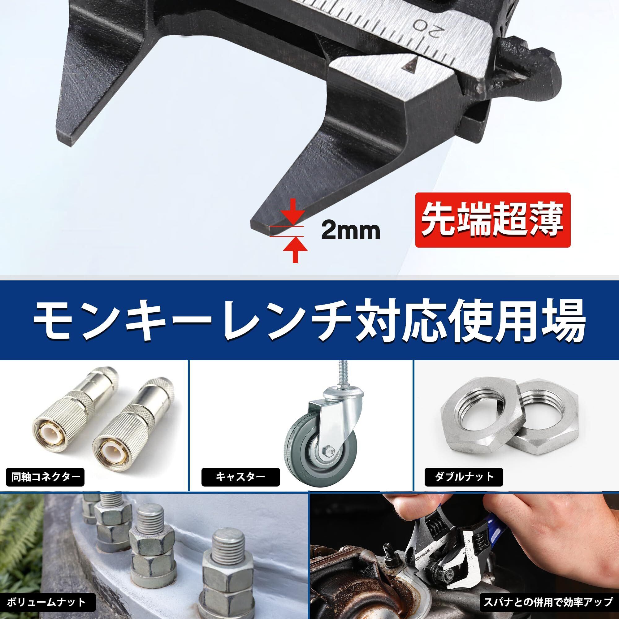 【超薄型先端 薄型ナットに最適】超薄型先端で、2mmの隙間にもぴったりフィット。従来のモンキーレンチでは困難な薄型ナットの取り付けも楽々対応。