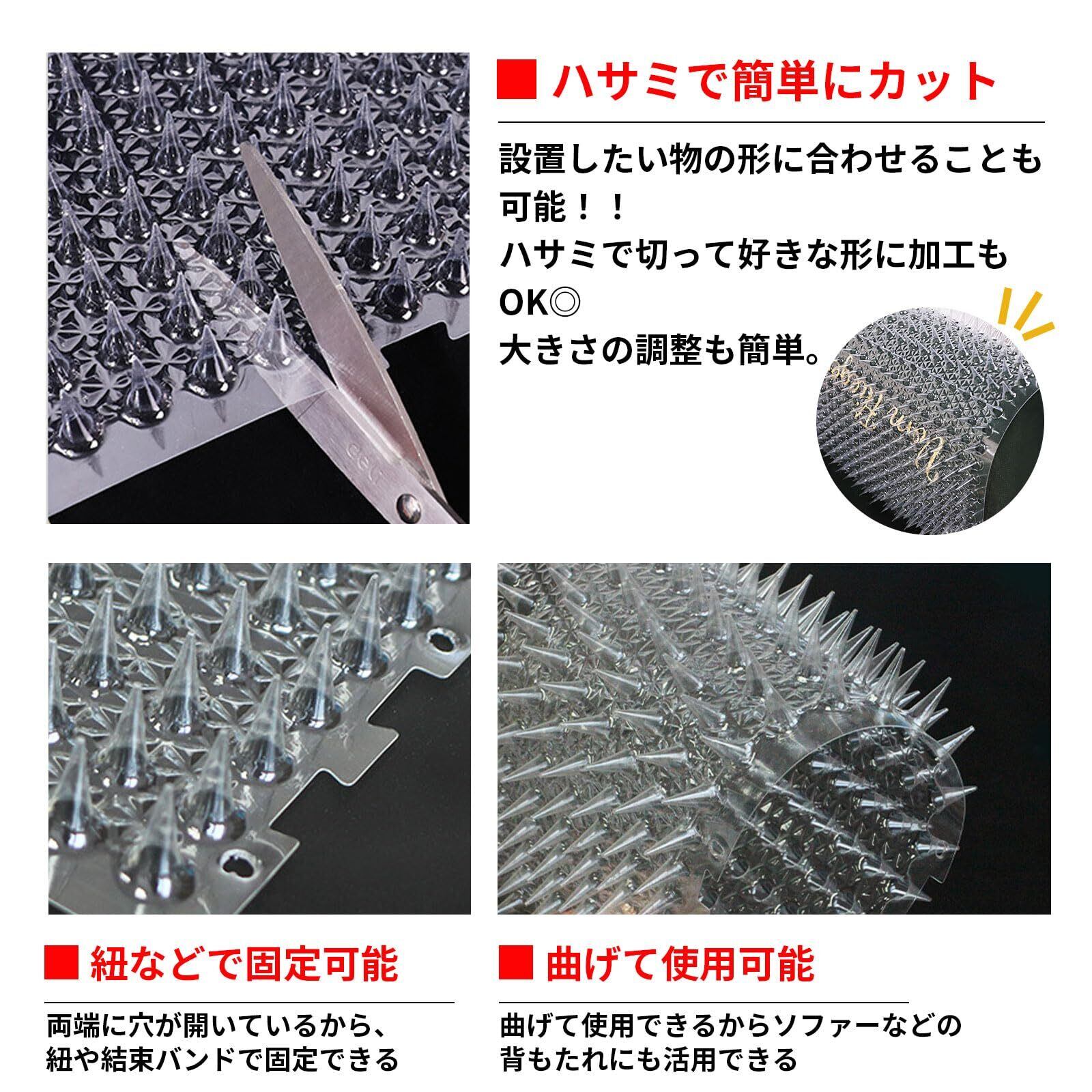 簡単設置で手間いらず端に穴が開いているので、紐や結束バンドを使って簡単に固定できます。工具は一切必要ありません。必要に応じて接着剤や両面テープをご使用することも可能です。・軽量で丈夫!長く使える軽くて丈夫なPET素材を使用しているので、長期間使用しても劣化しにくいです。また、重ねて収納できるので、場所を取らずに保管できます。 トゲトゲシートを使えば、猫や鳥の被害から大切な場所を守ることができます。もういたずらや糞害に悩まされる必要はありません。