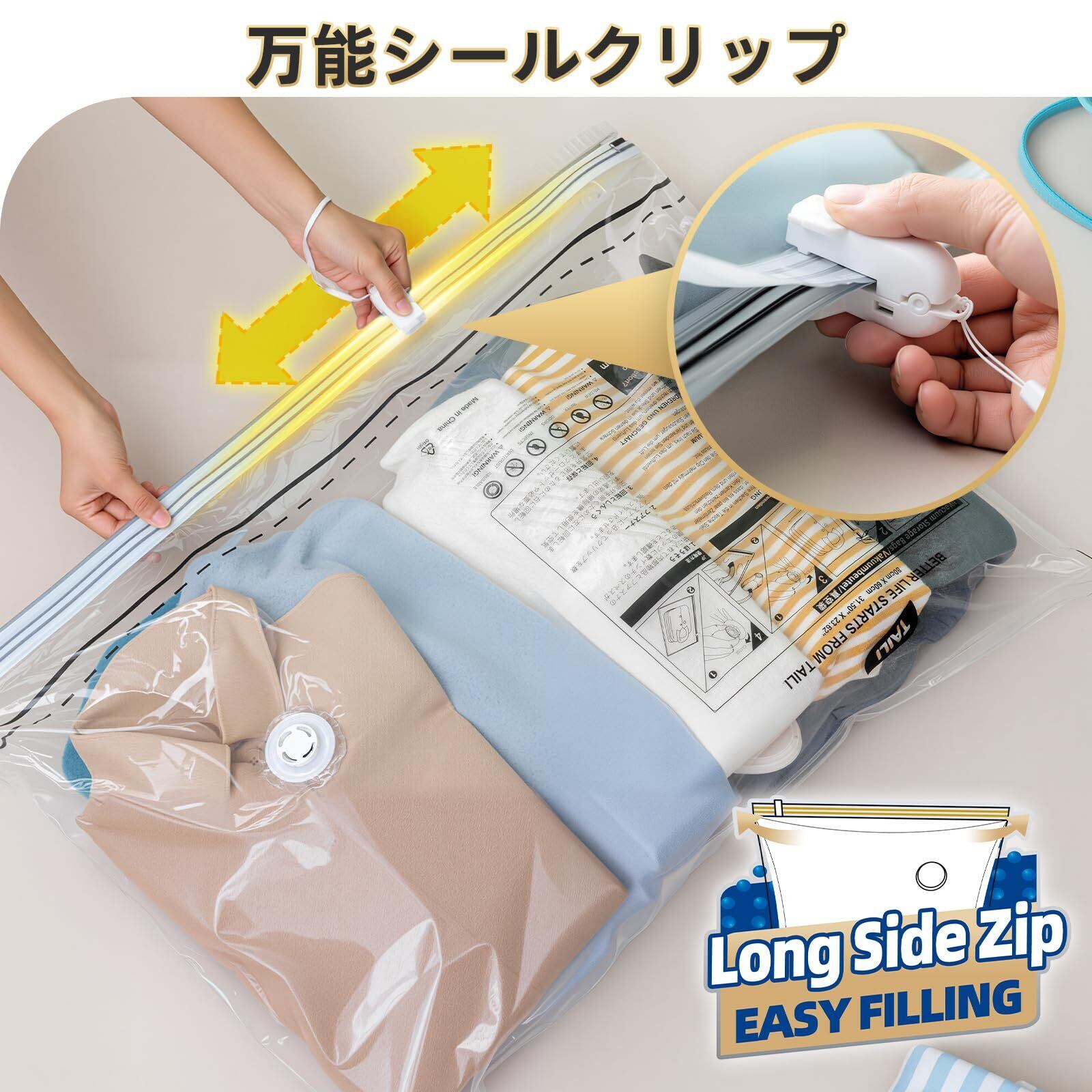 完璧な真空状態:布団圧縮袋にはスライダーと万能シールクリップが付属しており、圧縮袋の密封を簡単にします。使用する際には、クリップを白黒2つカラーのジッパーに揃え、ジッパーの色が変わるまでそっと引っ張るだけで密封できます。この圧縮袋はあらゆる種類の掃除機に適応できるアップグレードされたバルブを採用しており、素早く空気を排出した後、最後にバルブをそっと回転させるだけで圧縮袋が高真空状態を維持し、圧縮が完了します。さらに、この圧縮袋は再利用可能です