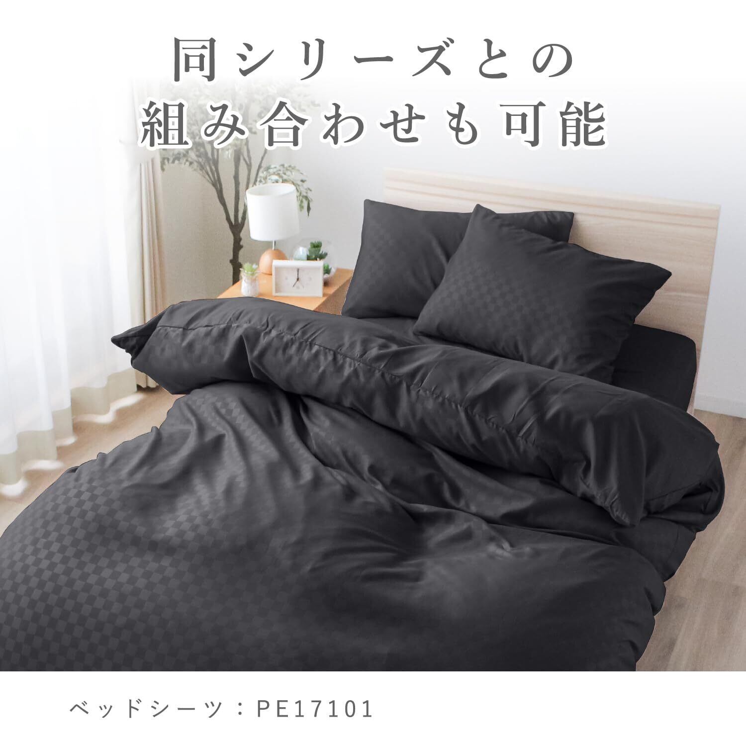 単色だが光の加減で市松柄が現れるモダンテイストの布団カバー。一見、無地のカバーにも見える柄が和洋室どちらの部屋にも合わせやすくなっています。