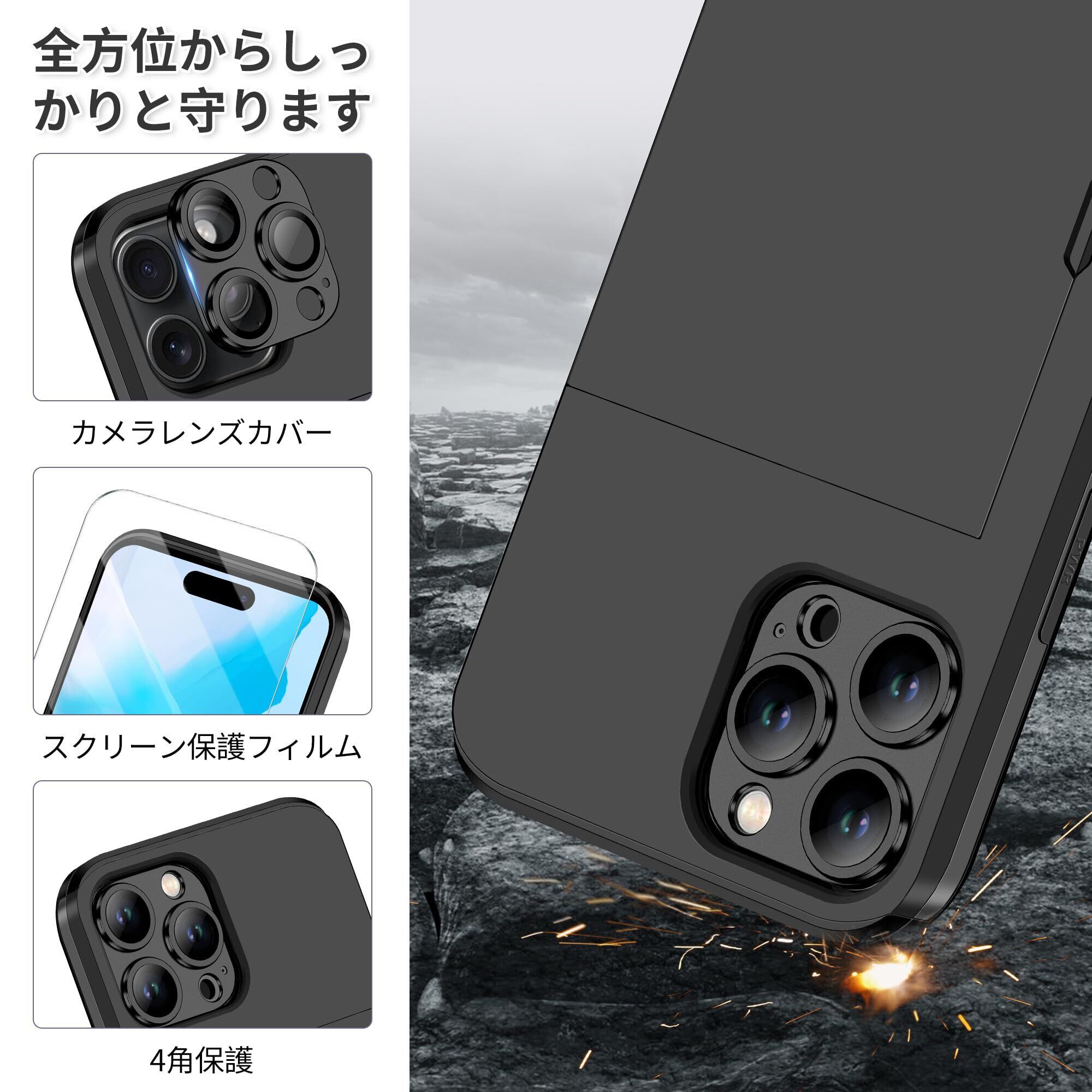 COOLDEN 対応 iPhone 16 Pro ケース カード 収納 背面 いphone16Pro ケース カード入れ 手帳型 9H強化ガラスフィルム付き カメラレンズカバー保護付き カバー 米軍MIL規格 耐衝撃最強 落下防止 全面保護 指紋防止 擦り傷防止 画面レンズ保護 マット質 スマホケース 対応 iPhone16プロケース 対応 アイフォン16Pro ケース 6.3インチ ブラック