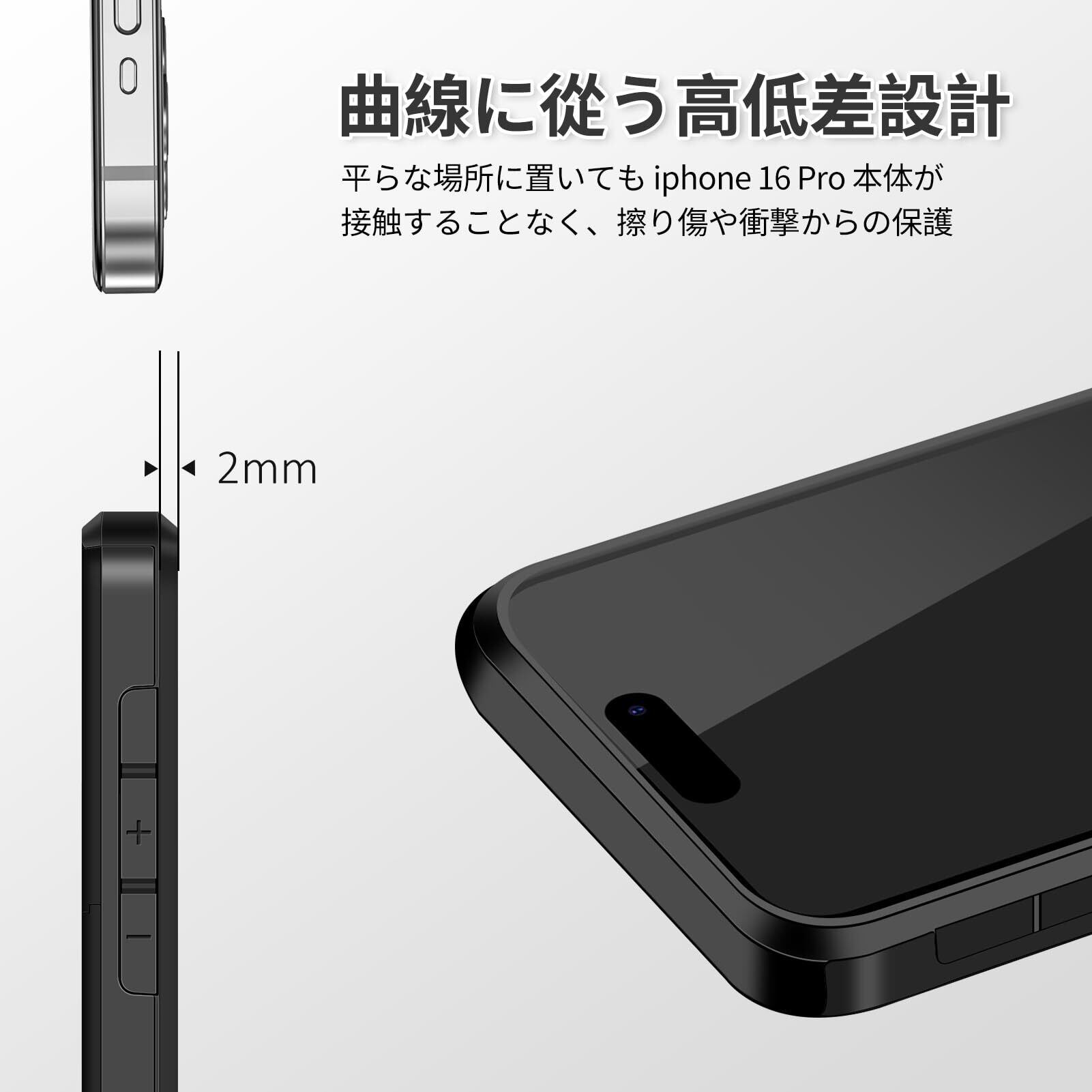 【強化ガラススクリーン保護フィルム】いPhone 16Proのスクリーン保護フィルムは9 H強化ガラスから作られ、硬度が強く、携帯電話のスクリーンを傷、衝突、割れから保護することができる。疎水性と疎油性コーティングは指紋や汚れを防ぎ、高品位の視覚体験と滑らかな感触をもたらします。