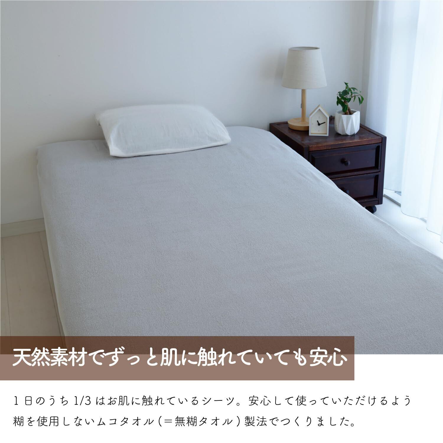 【コットン100%の天然素材でずっと肌に触れていても安心】1日のうち1/3はお肌に触れているシーツ。安心して使っていただけるよう糊を使用しないムコタオル(=無糊タオル)製法でつくりました。両面パイルで優しい肌触り。