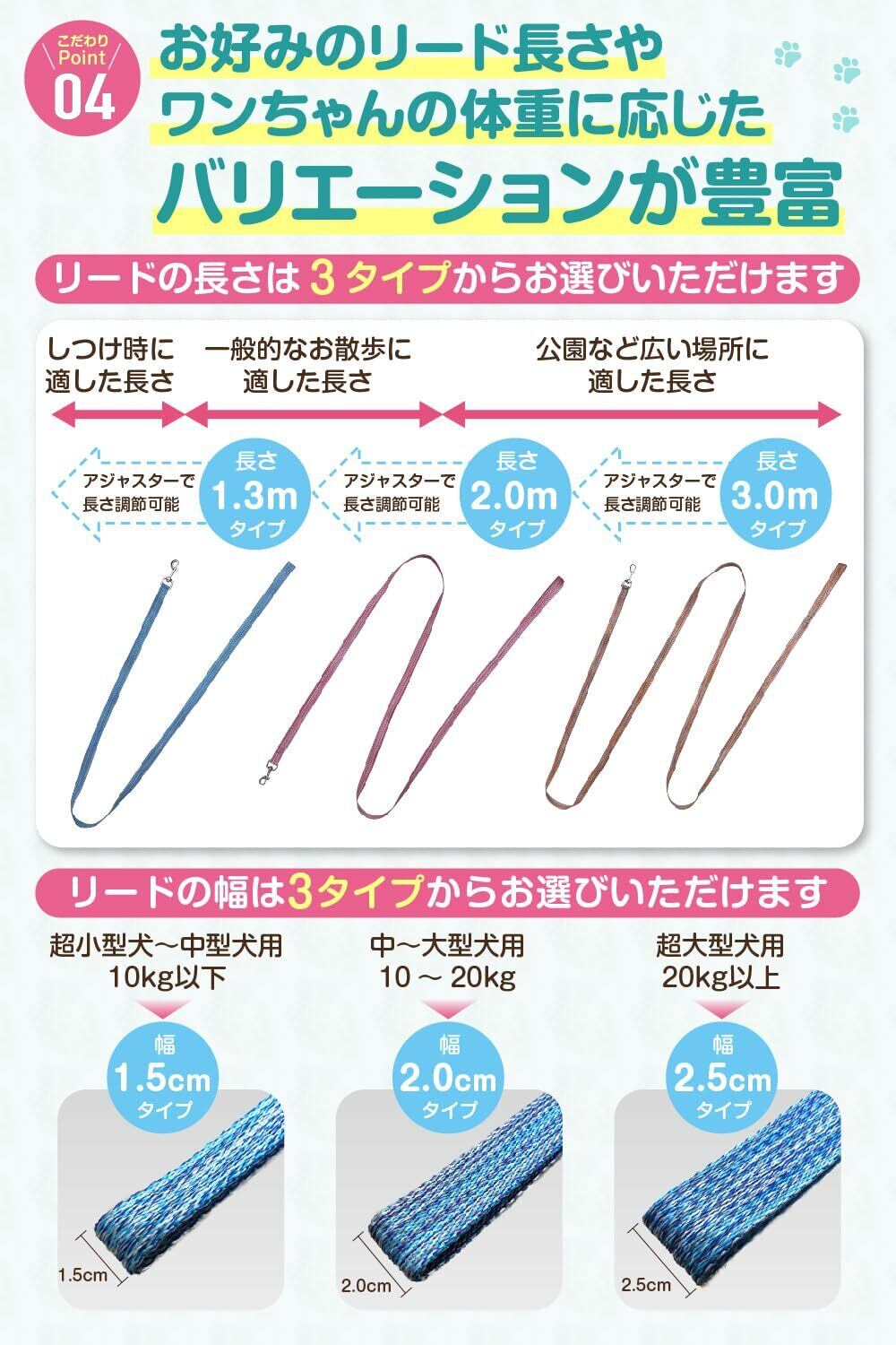 【小型犬から大型犬まで対応】子犬・小型犬・中型犬・大型犬と、ワンちゃんによってリードの太さが選択できます。また、ショートリードからロングリード(3m)までラインナップを揃えておりますので、使用用途に応じてお選びいただけます。