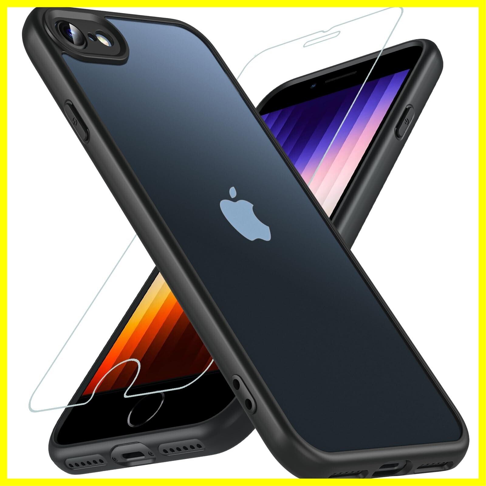 OWKEY iPhone SE ケース iPhone SE3 ケース iPhone SE2 カバー【ガラスフィルム付き】半透明 薄型 軽量 米軍MIL規格 全面保護 耐衝撃 レンズ保護 ストラップホール 黄ばみなし 耐久性 iPhone SE2/SE3/ iPhone8/ iPhone7 用スマホケース 4.7インチ ブラック