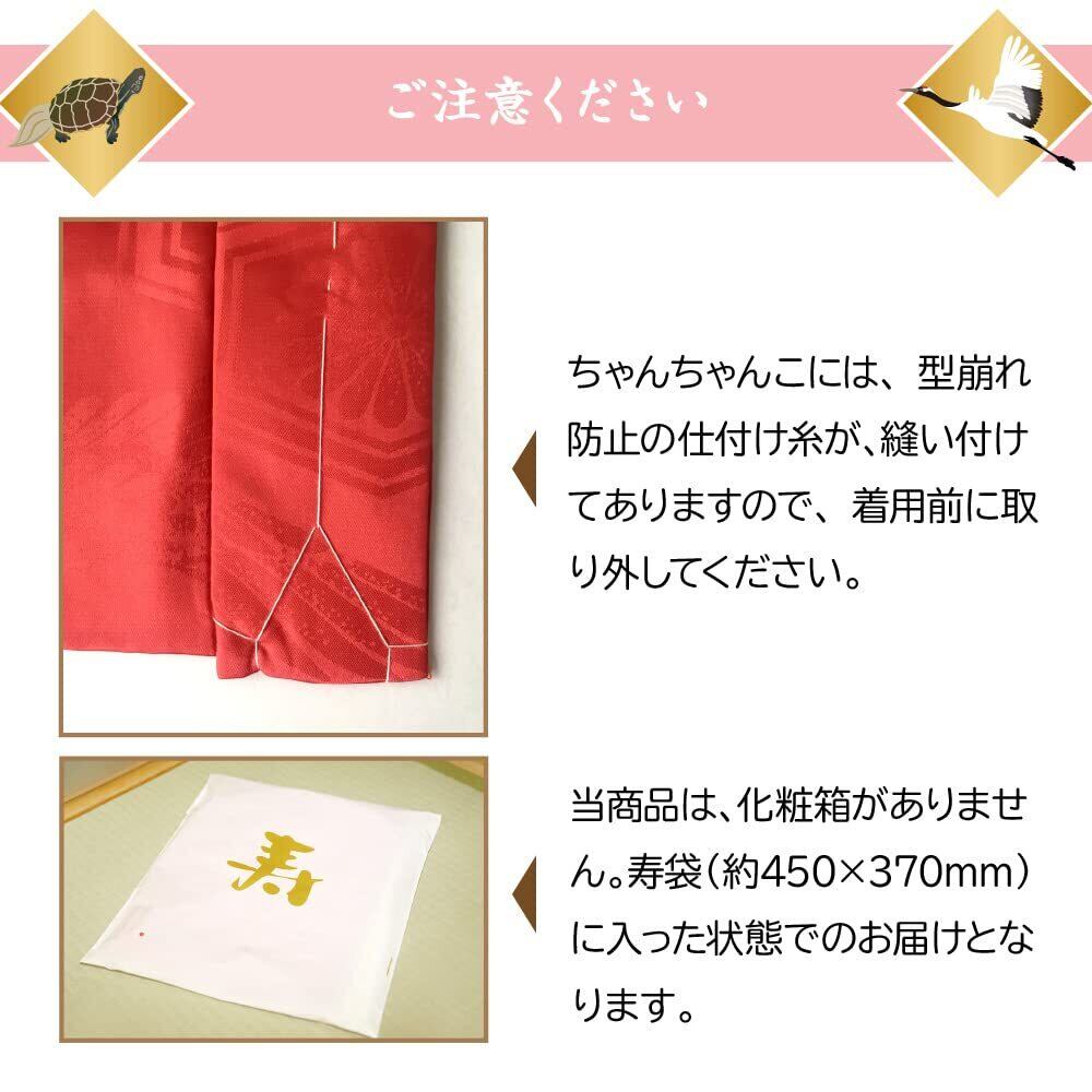 【ご注意】次の内容をよくご確認のうえ、あらかじめご了承ください。・表記サイズは実寸値となります。個体差がありますので、お届けする商品のサイズと多少の誤差が生じる場合があります。・ちゃんちゃんこには、型崩れ防止の仕付け糸が縫い付けてありますので、着用前に取り外してください。・ちゃんちゃんこ・帽子は、洗濯は40度以下の水温で手洗い、もしくは洗濯ネットを使用してください。漂白剤は使用できません。干す際は、ぬれ平干ししてください。アイロンがけはお控えください。・当商品は、化粧箱がありません。寿袋(約450×370mm)に入った状態でのお届けとなります。・製品改良のため、デザインおよび仕様は予告なしに変更することがあります。