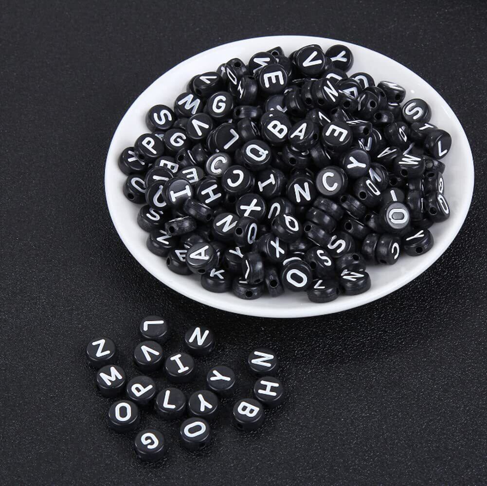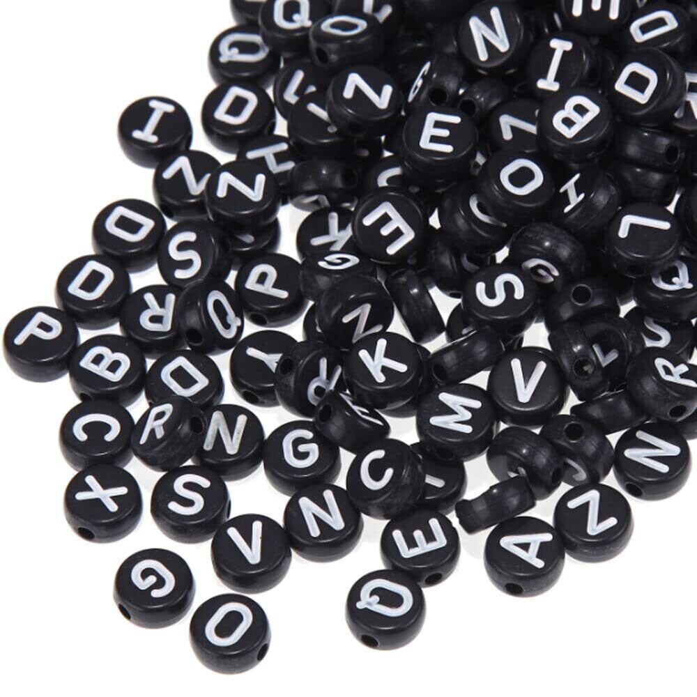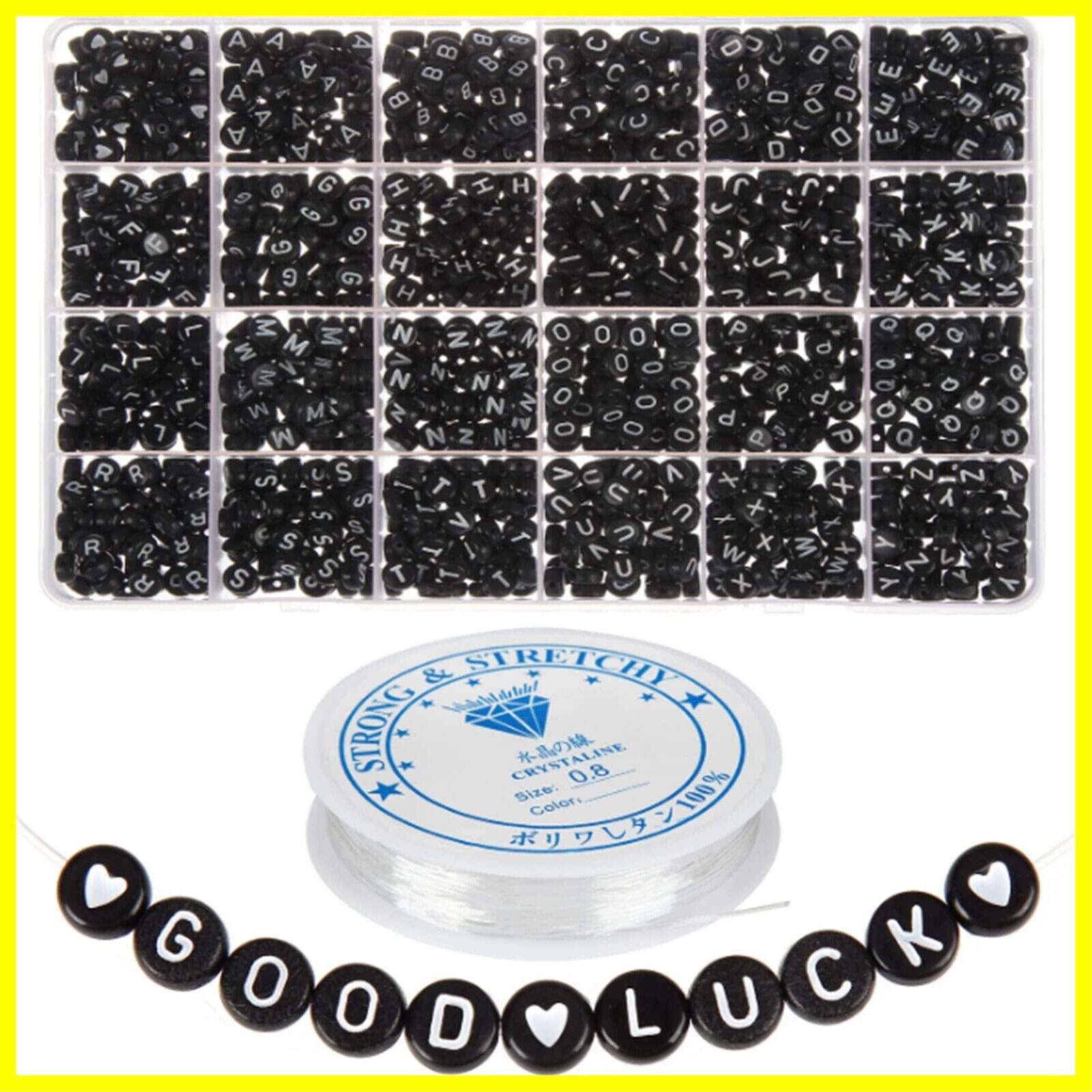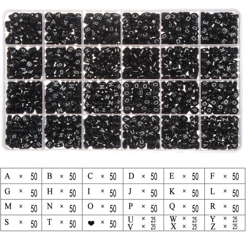 BetterJonny アルファベットビーズ 約 1200ピース ブラック A-Z 文字 ビーズ 7x4mm 伸縮性のある糸1ロール付き とのアクリル文字ビーズキット ジュエリー&キッズ&クラフト&名前ブレスレット作成用…
