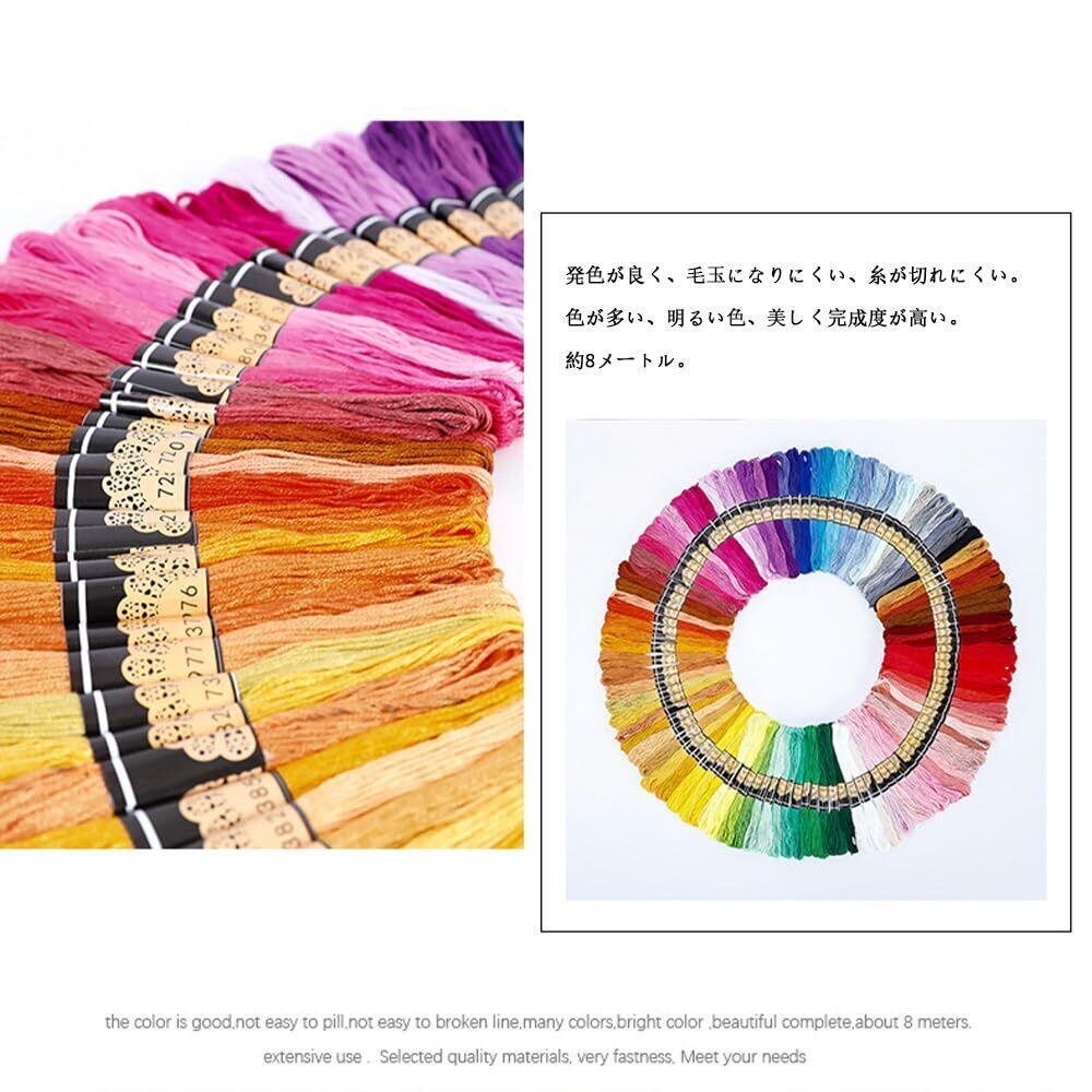 "1.【刺しゅうキット内容】:刺繍糸*24。 2.【サイズ】:刺繍糸長さ:1本あたり (約)8m <6本綴り>。 3.【材質】:ポリエステル、綿。 4.【特徴】:高品質素材の刺繍糸24色セット。 5.【幅広く適用の刺繍糸24色セット】:刺繍はもちろん、裁縫、手編みなど、手芸、プレゼントに、入園でのお名前の刺繍、洋服のボタン付け、マーク付けなどにも、いろいろとお使い頂けます。色の選定はできませんが、色彩豊かなバリエーションの刺繍糸を手にすることで、作品の表現方法も広がることでしょう。"