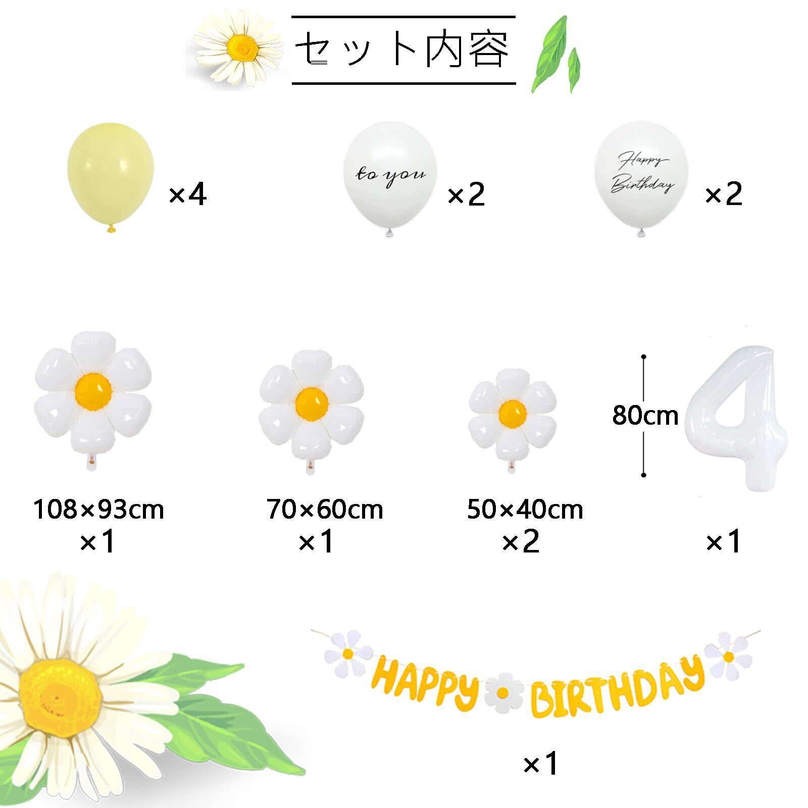 セット内容 - ゴム風船×8(HAPPY BIRTHDAY × 2、TO YOU × 2、うすい黄色× 4)、フェルト布ガーランド×1組、デイジーバルーン ×4、数字バルーン×1、リボンひも (10m)、両面テープ [ゴム風船専用]。