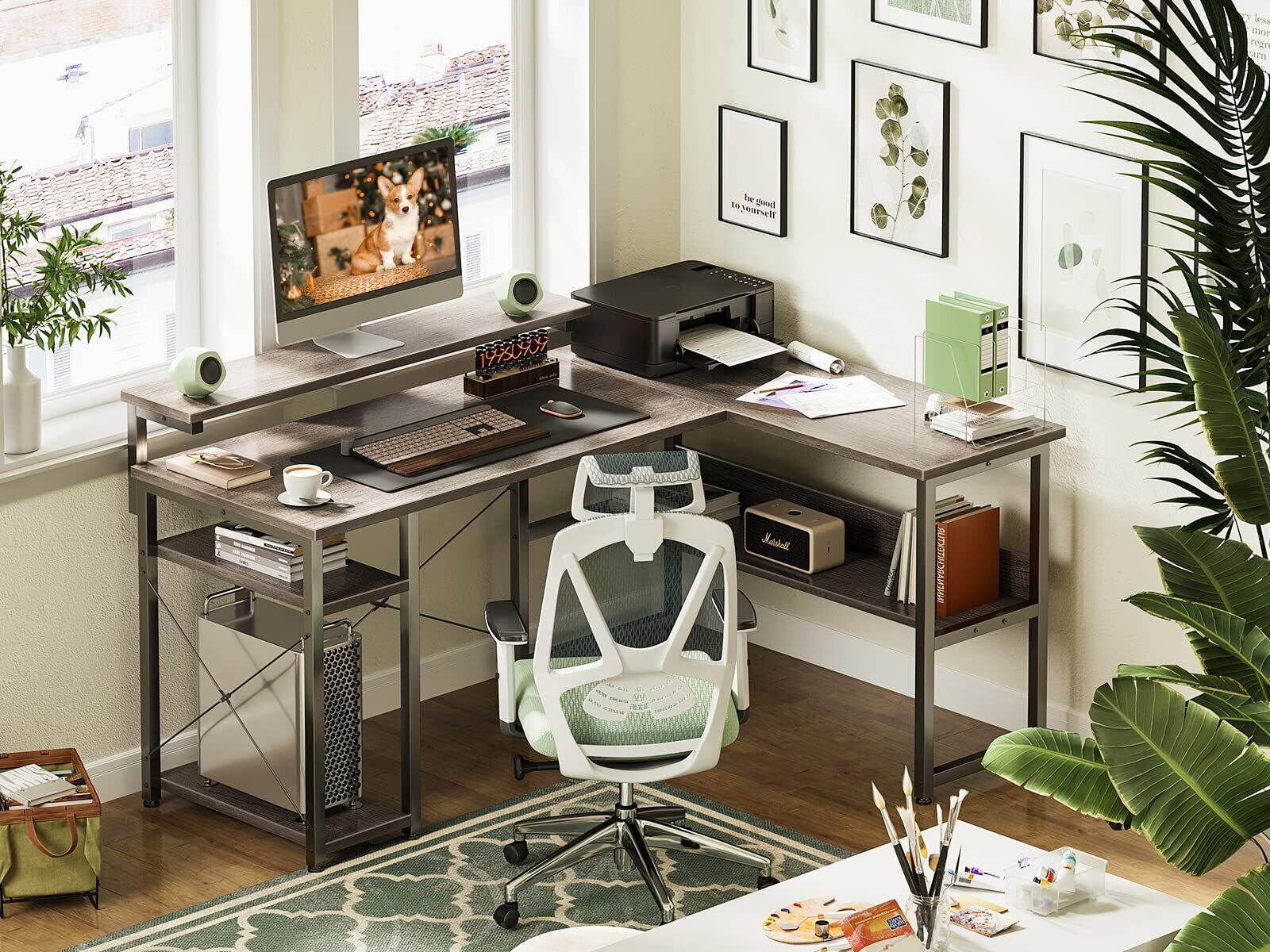 【棚付きデスク・収納力満載】デスクの足元には一体型のラックが備え、本や書類などを使いたい時にサッと取り出せます。たっぷりの収納でデスク周りをスッキリ快適に!L字型のデザインで部屋のコーナーを最大限に活用でき、ご家庭でもオフィスでも、日常の仕事に十分なスペースを確保できます。