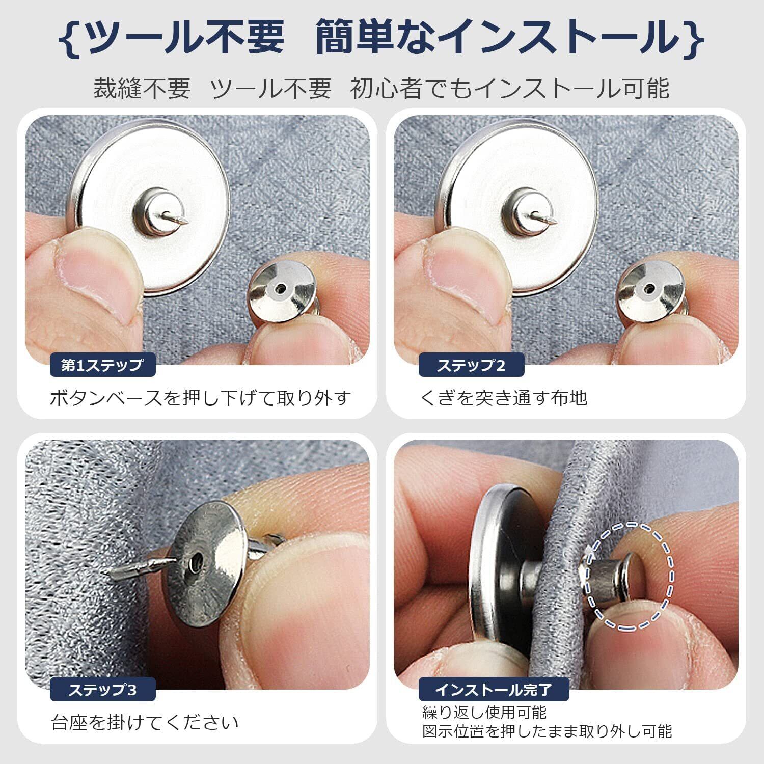 【インストール方法】 ①カーテンとマグネットのボタンを準備します。 ②ボタンの釘をカーテンから通し、ベースを覆います。 ③インストールが完了します。 ④両側インストールが完了する効果。
