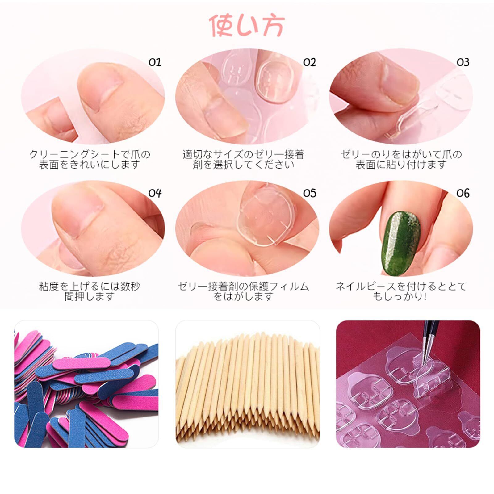 【注意】内容:ネイルチップ24枚+付替え用両面テープ+取り外し用ウッドスティック1個+爪やすり1個。