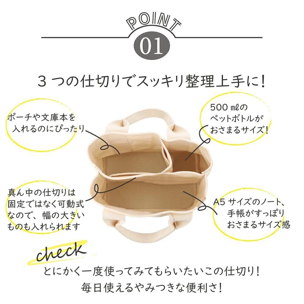サプライズ:3つの仕切りと2つのポケットでスッキリ収納できるミニトートバッグ。 仕切りがあるので荷物を綺麗に整理整頓して入れられます。見た目以上の収納力と機能性。