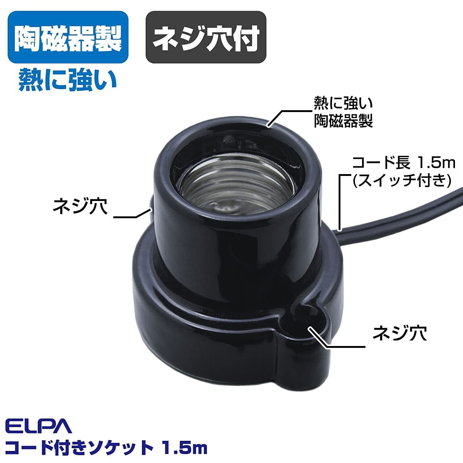 エルパ (ELPA) コード付ソケット (口金 E26 / 1.5m / ブラック) 中間スイッチ付 ( KP-M2615H(BK) )