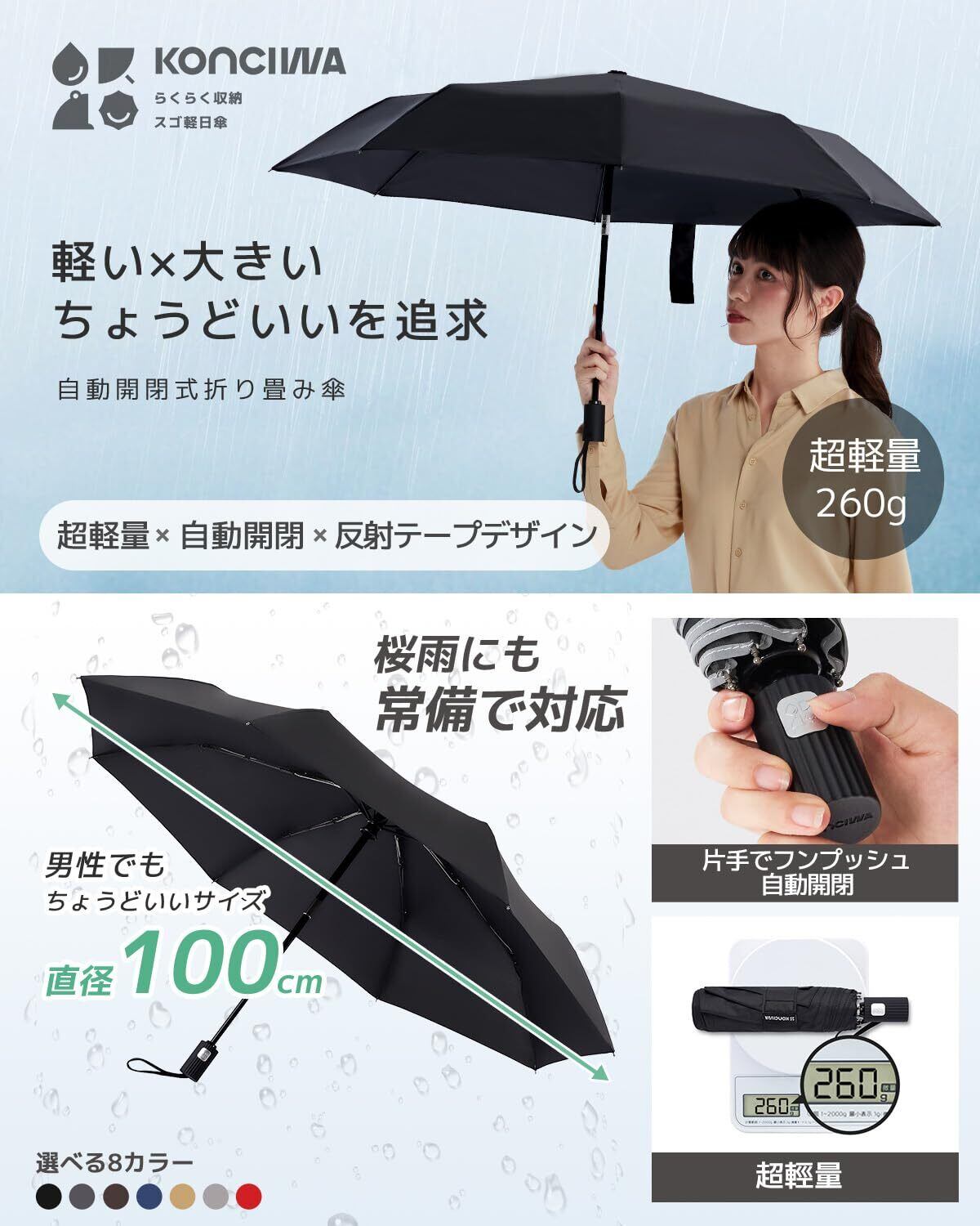 Konciwa 折りたたみ傘 260g軽量 自動開閉 8本骨 折り畳み傘 メンズ ワンタッチ 自動開閉 おりたたみ メンズ レディース 折りたたみ傘 ワンタッ 撥水速乾 耐強風 男女兼用 携帯しやすい