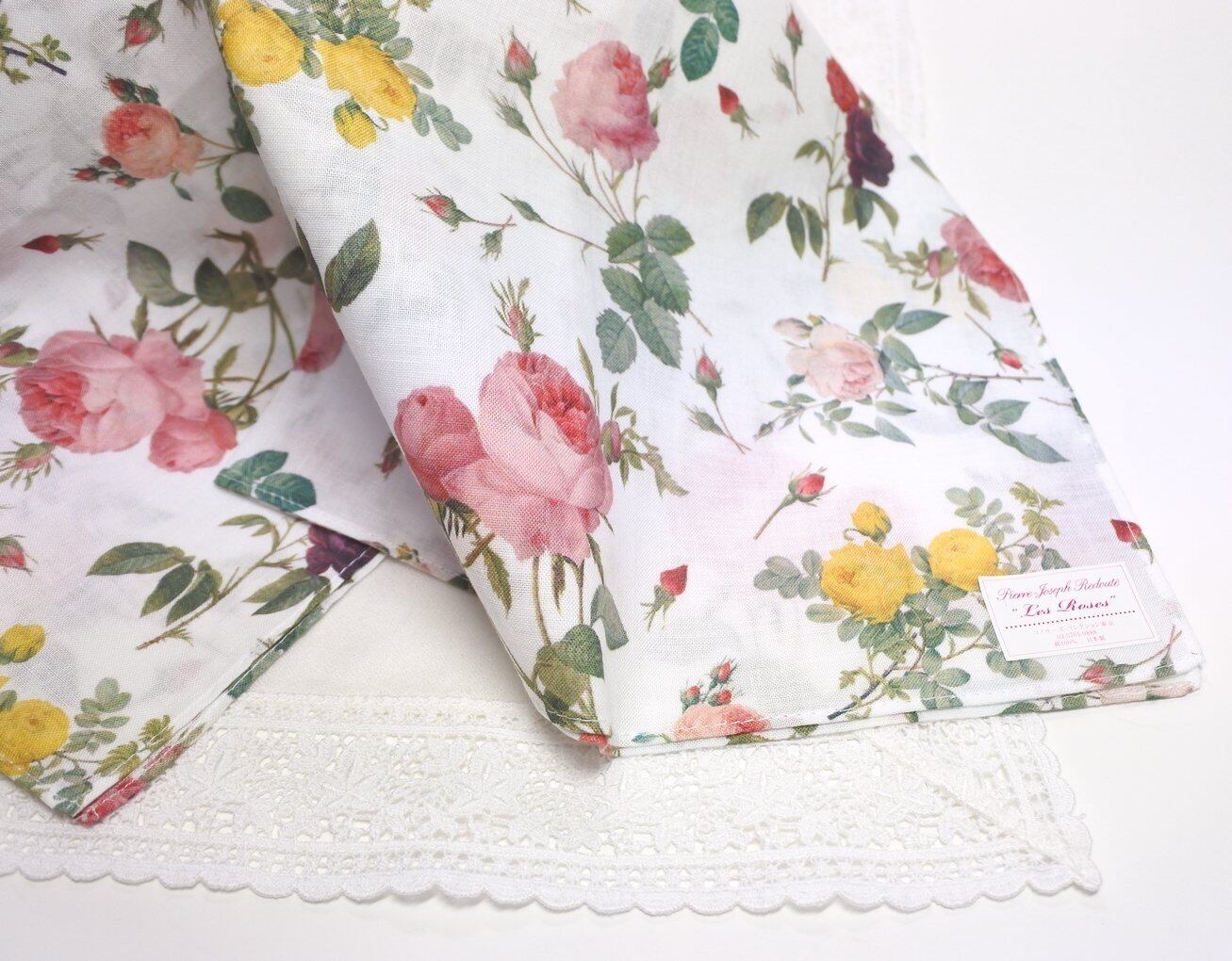 ルドゥーテの『レ・ローズ/バラ図譜』シリーズより、最も有名な作品を選んで作ったオリジナル商品です。ルドゥーテの代表的なバラとつぼみが全体に散らされた、美しくエレガントなデザインのジークレー・ハンカチ。こちらは人気のジークレー・ハンカチ・シリーズの『ガーデン』。ルドゥーテが描いた美しいバラをアレンジにして、バラの庭園をイメージしたデザインとなっています。綿布上にジークレー版画と同じ手法で精密に刷った、とてもアーティスティックで色彩豊かなワンランク上の高級大判ハンカチです。大判タイプなのでプチ・スカーフとしてお使いいただくのも素敵。膝の上に広げても華やかな印象です。ガーゼより織り目が細かく滑らかで、吸水性の良いコンパス地で作りました。日本製。※ジークレー版画とは、デジタル技術を用いて制作される精密な版画で、デジタル・リトグラフとも呼ばれ、原画を再現するのに最も適している版画技法ともいわれています。