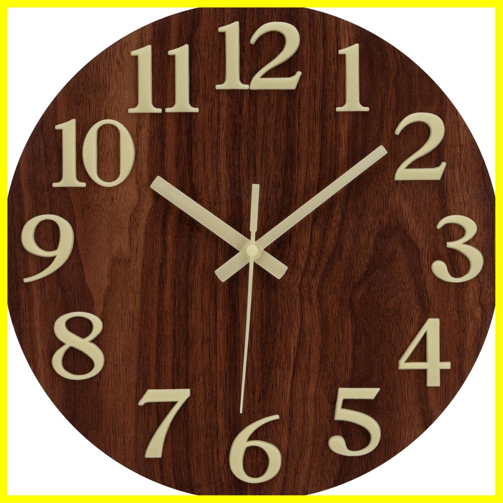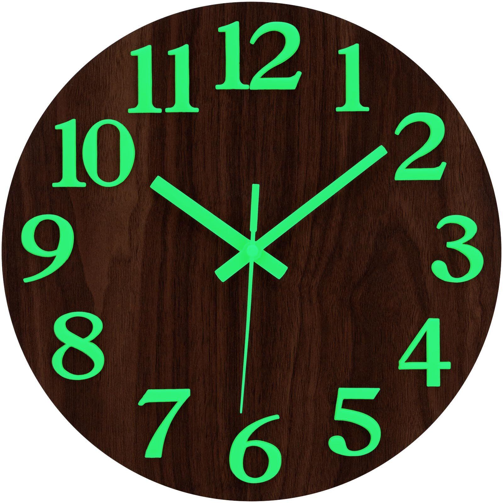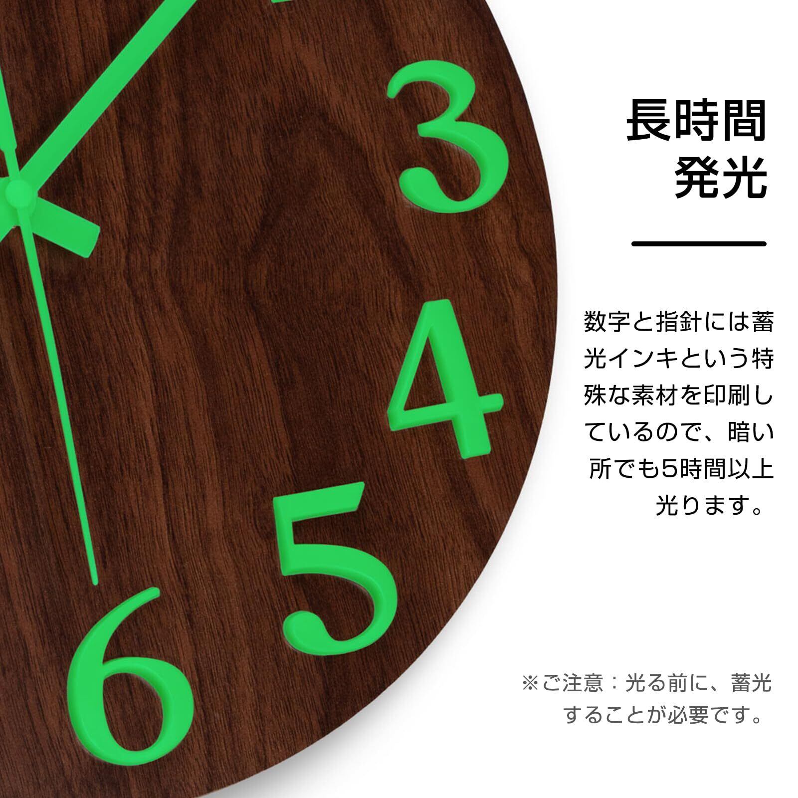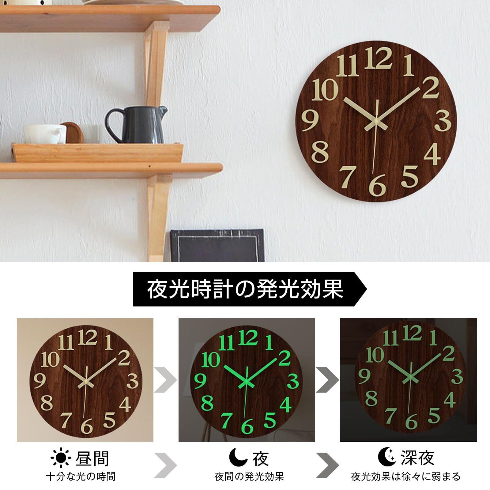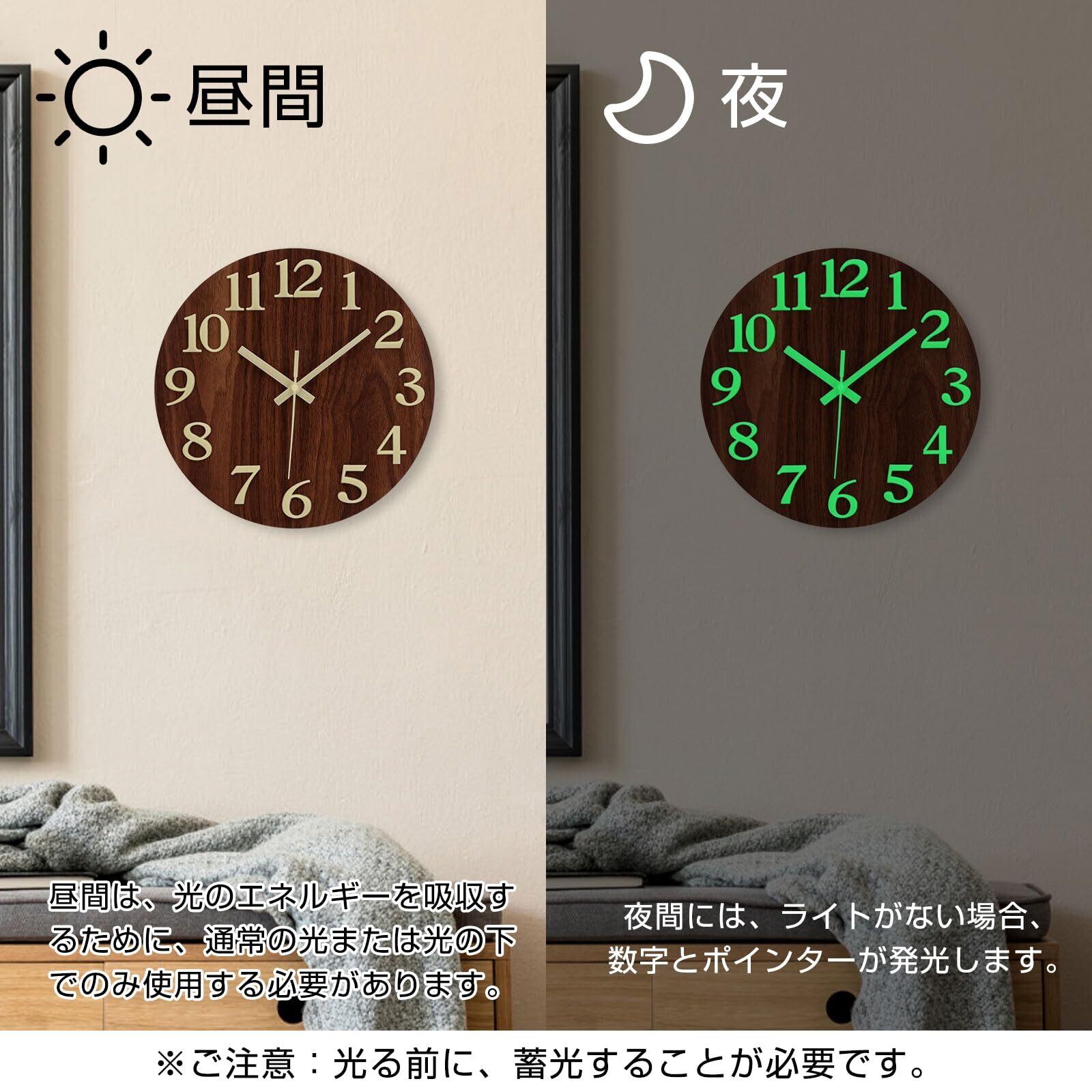 掛け時計 夜光 壁掛け時計 木製 静音 連続秒針 大文字 暗くなると自動で光る時計 夜でも見える 蓄光発光 3D大文字 読みやすい 直径30cm おしゃれ 自宅 寝室 インテリア (ウォールナット)