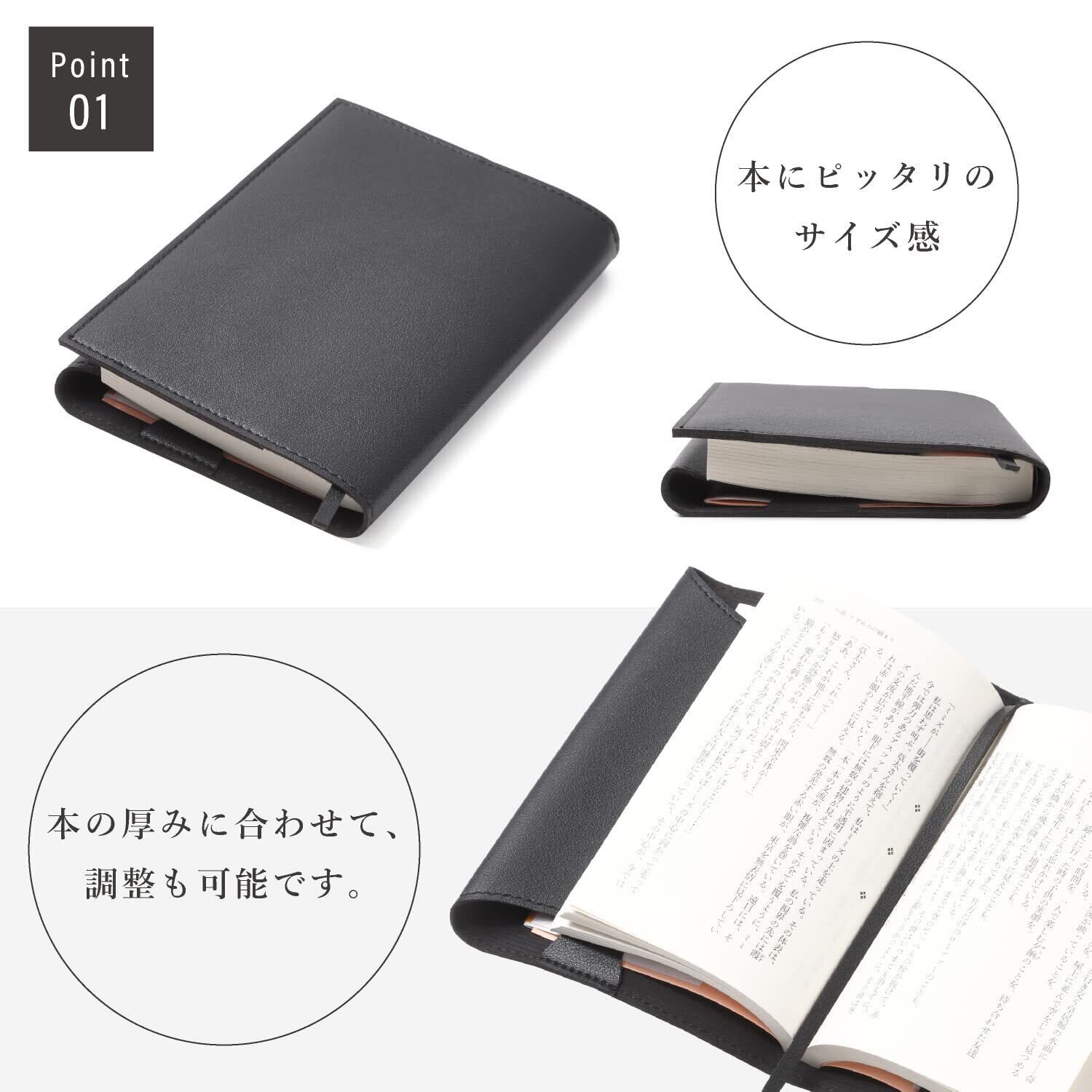 ブックカバー 厚み調整可 栞付き 合成レザー (ブラック, A5)