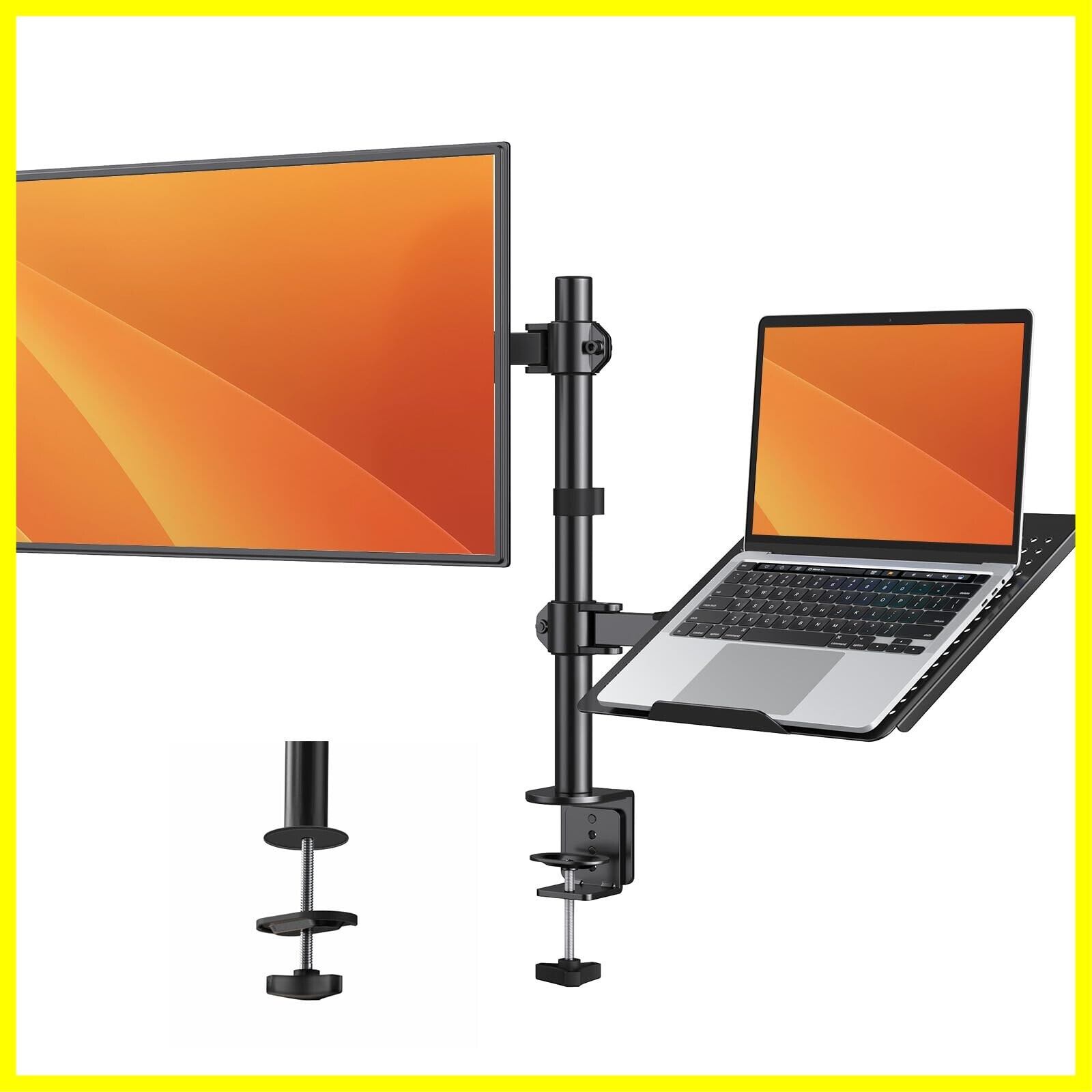 【モニター&ノートパソコンがこの1個で設置可能!】2in1モニターアームでノートパソコンとモニターの高さを揃っており、画面間の視線移動が少なく、また途切れにくくなるため、作業効率の向上が見込めます。また、デスク上に置いていたノートパソコンとモニターをアームに設置することで、デスク上を広く使えるようになります。